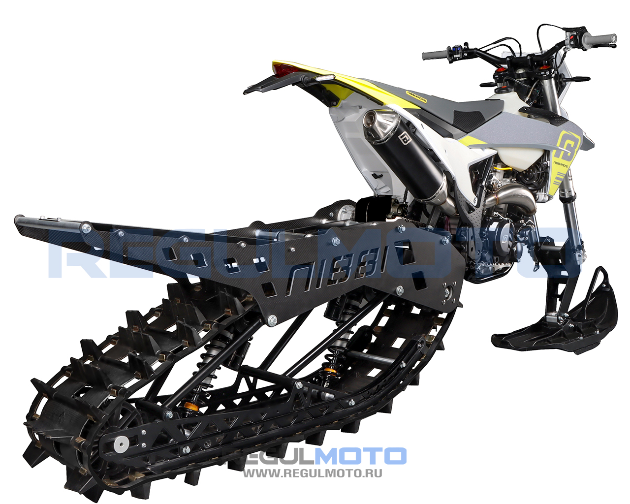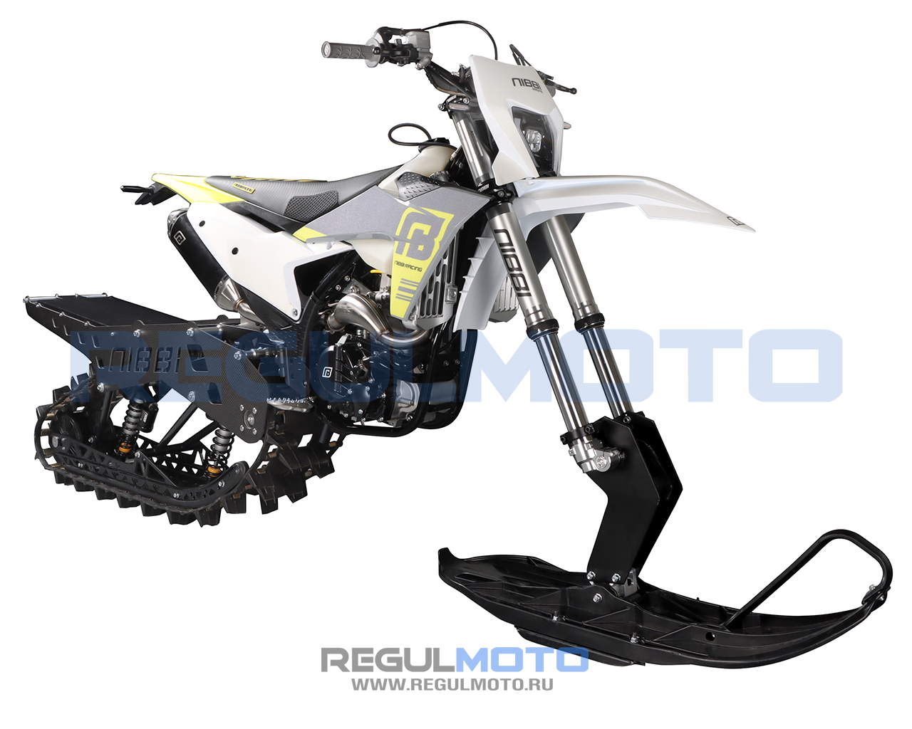 NIBBI Vanguard R-120 — это система переоборудования, которая позволяет превратить кроссовый мотоцикл в сноубайк для экстремальных зимних заездов. Комплект заменяет переднее колесо на лыжу, а заднее — на гусеницу, что открывает новые возможности для покорения снежных просторов.