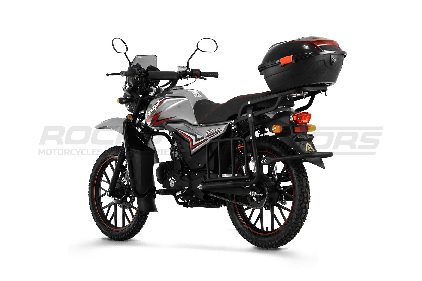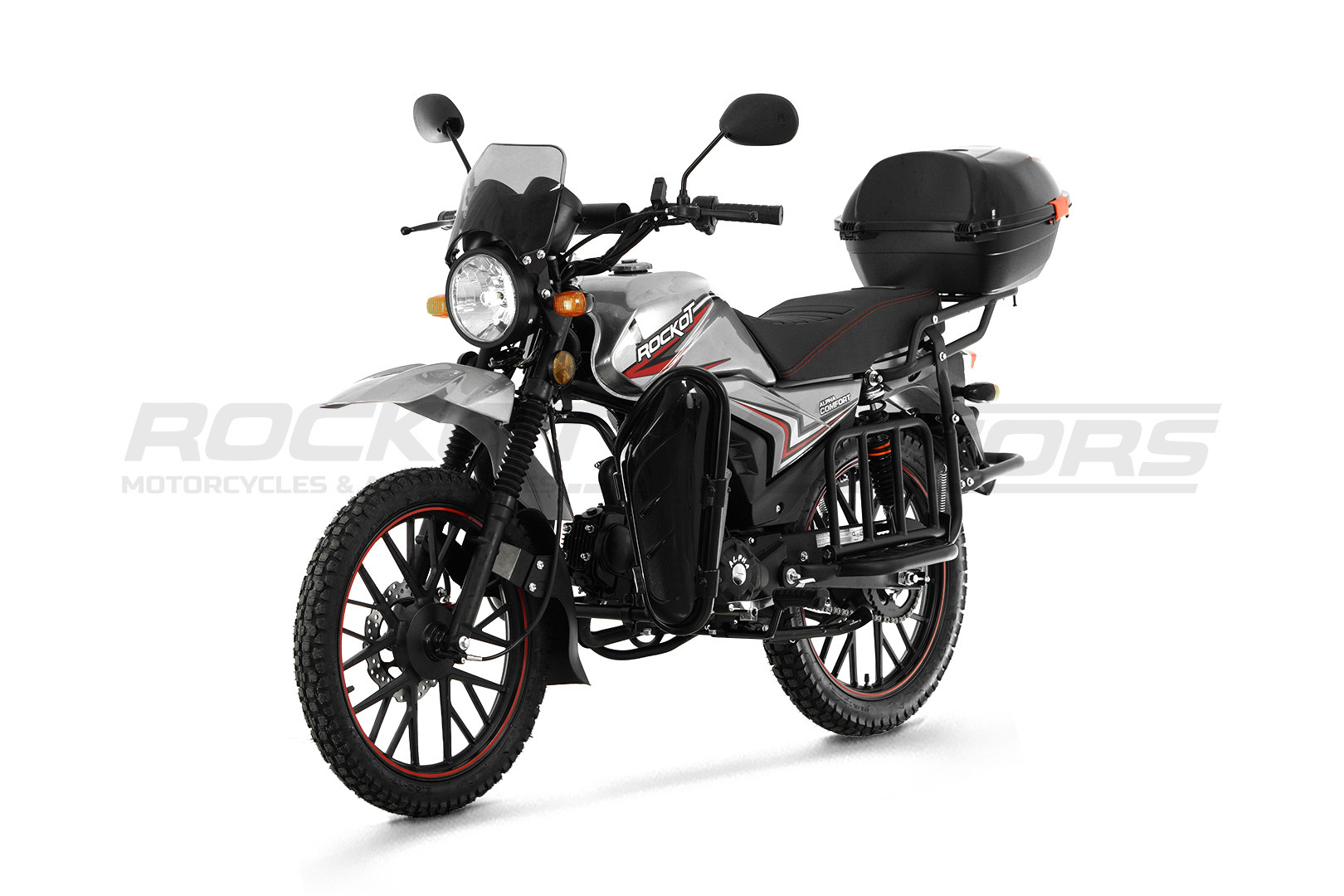 Мопед ROCKOT ALPHA COMFORT оснащается тем же топливным баком и облицовочным пластиком, что и мотоцикл QUEST 150. Их основное визуальное отличие – это расцветки. ROCKOT ALPHA COMFORT выпускается в четырех цветах: синий, красный, черный и серый. Для снижения нагрузки водителя от встречного потока воздуха, над круглой классической фарой установлено ветровое стекло. Также в данной комплектации мопед обрел боковые дуги со встроенными карманами, которые не только вмещают большой объем груза, но также выполняют ветрозащитную функцию. Задние боковые рамки и вместительный центральный кофр прямо указывают на приспособленность мопеда к выездам на природу, будь то пикник, рыбалка или охота. Вы с комфортом проедете везде, а благодаря вместительности багажной системы, сможете организовать комфорт вокруг себя.