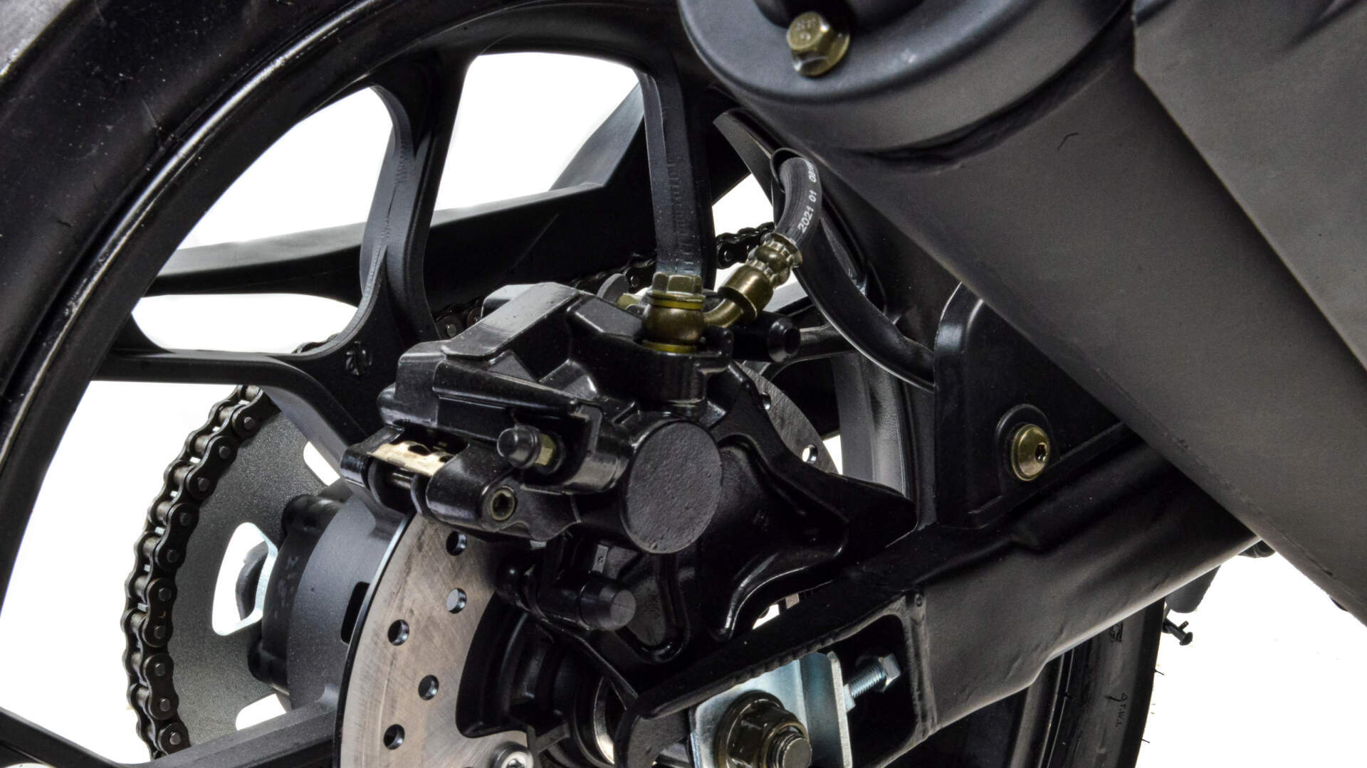 Также на новинке установлены двухпоршневые передние тормоза, литые алюминиевые обода , передняя вилка перевёрнутого типа с большим ходом, которая обеспечивает отличную управляемось для комфортного передвижения, как по городу, так и по бездорожью.