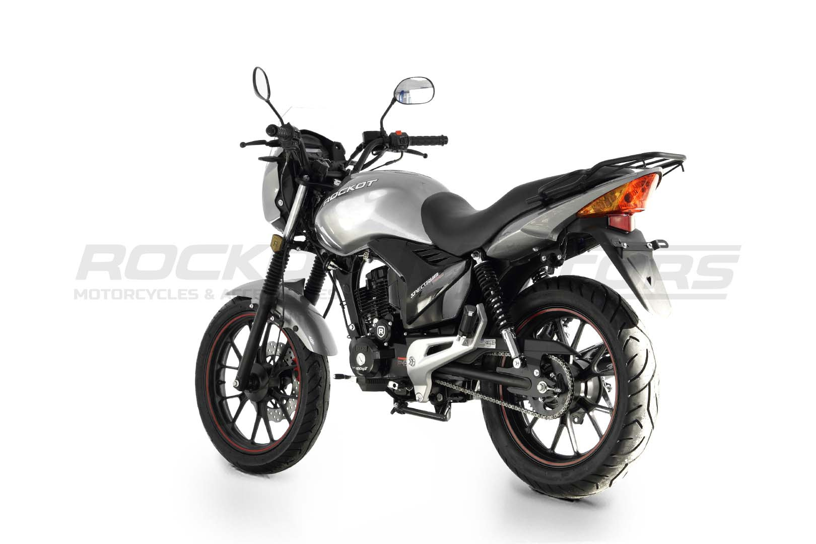Спереди и сзади, мотоцикл ROCKOT SPECTRUM 150 украшают литые колесные диски диаметром 17 дюймов, но которых установлены шины с шоссейным типом протектора. Размерность шин: 100:80-17 спереди и 120:80-17 сзади.