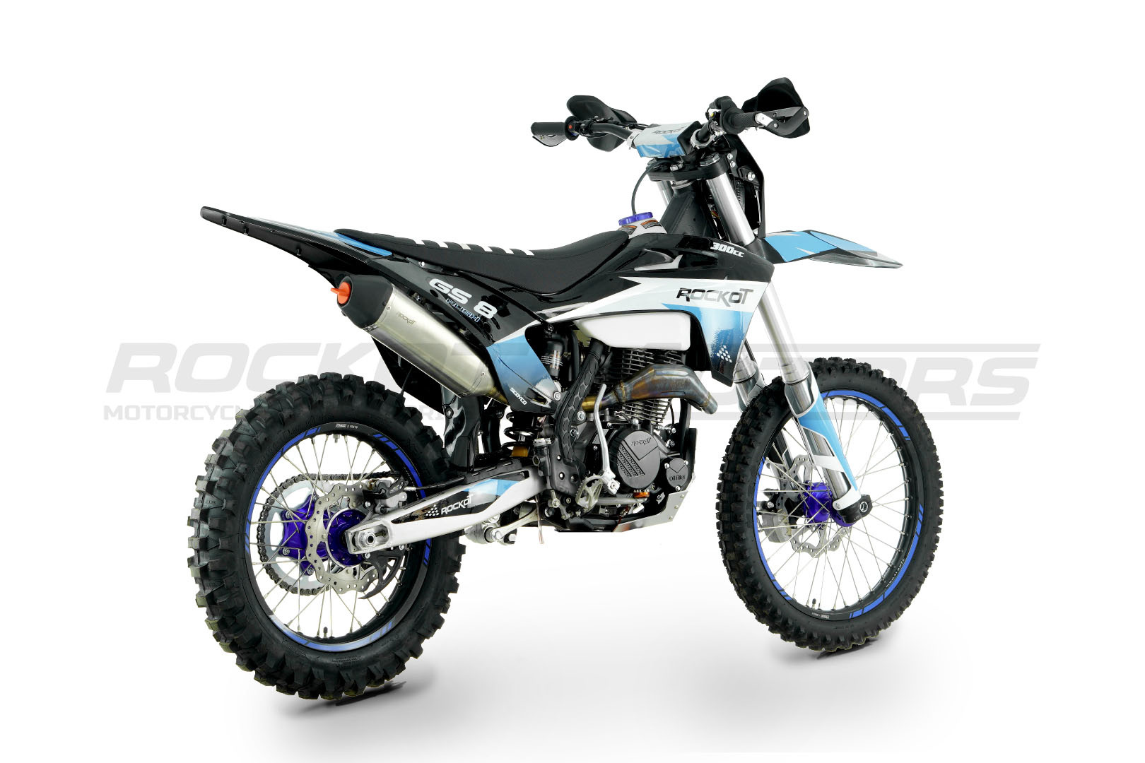 ROCKOT GS 8 RUSH - построен на новой раме S8, в облицовке австрийского GASGAS. Пластик отлит в черном цвете, на который нанесена яркая, контрастная графика в сочетании черного, синего и серого цветов. Расцветка графики эффектно подчеркивает каждую деталь мотоцикла. Рама, траверсы, руль, рычаги тормоза и сцепления, окрашены в черный цвет. В синем цвете выполнены колесные ступицы, CNC крышка бака и защитные наклейки на ободьях колес. Все остальные детали мотоцикла окрашены в серый, металлический цвет.