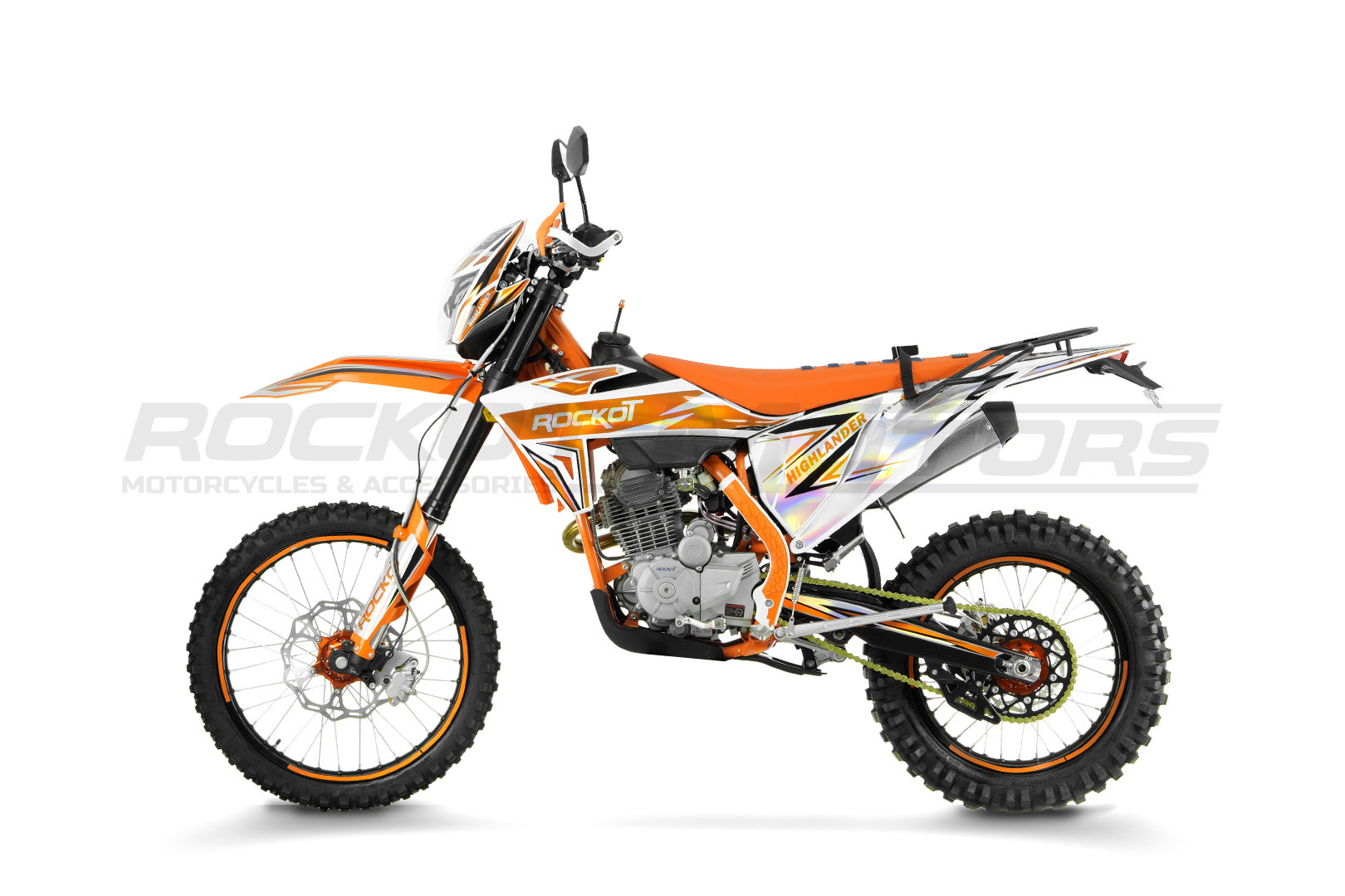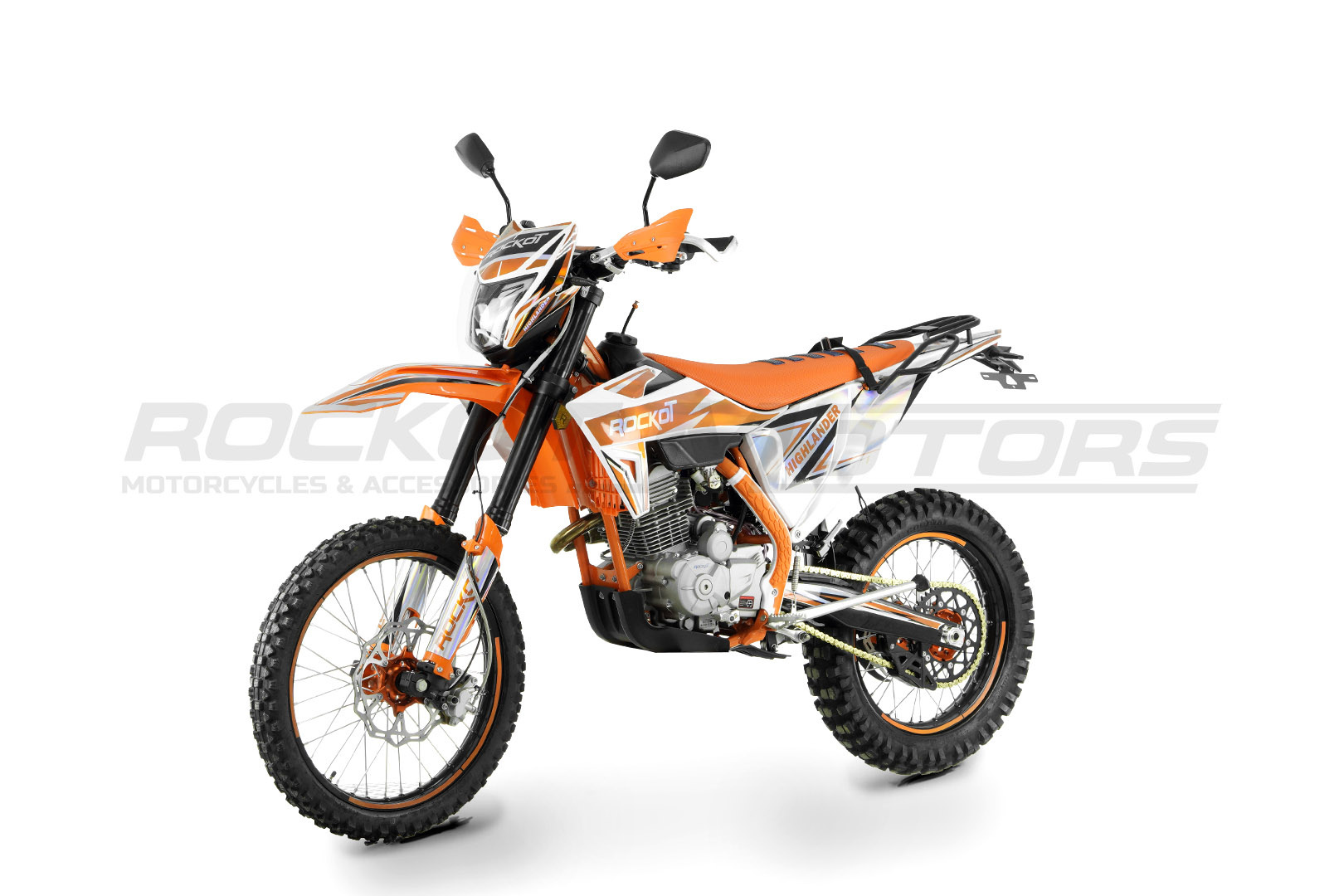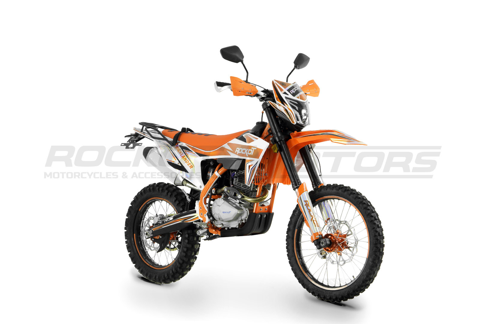 ROCKOT HIGHLANDER имеет уникальный дизайн, в котором воедино совмещены стили пластика “KTM24” и “KTM21”. Сам пластик скомбинирован из белого и оранжевого цвета, что эффектно сочетается с рамой, окрашенной в оранжевый цвет. Дизайн графики выполнен все в тех же белом и оранжевом цветах, которые нанесены на пленку с голографическим эффектом. Также новая модель 2024 года получила уникальную фару с полностью светодиодной оптикой. На черных ободах колесных дисков нанесены защитные наклейки яркого-оранжевого цвета.