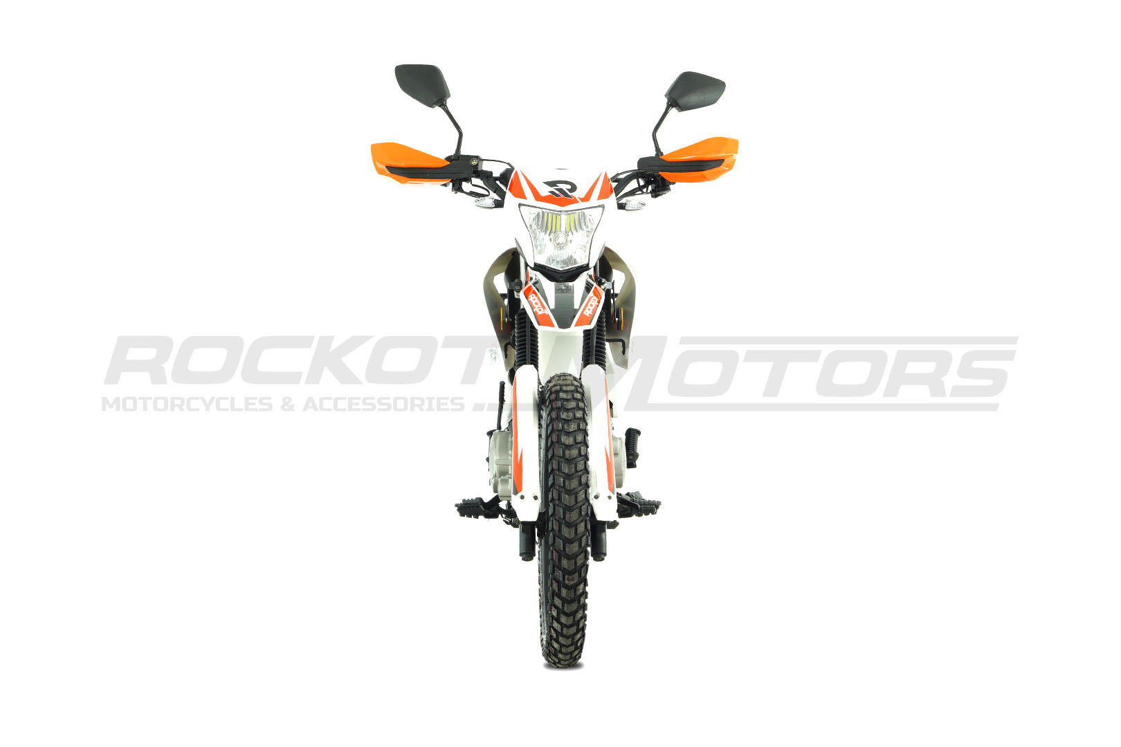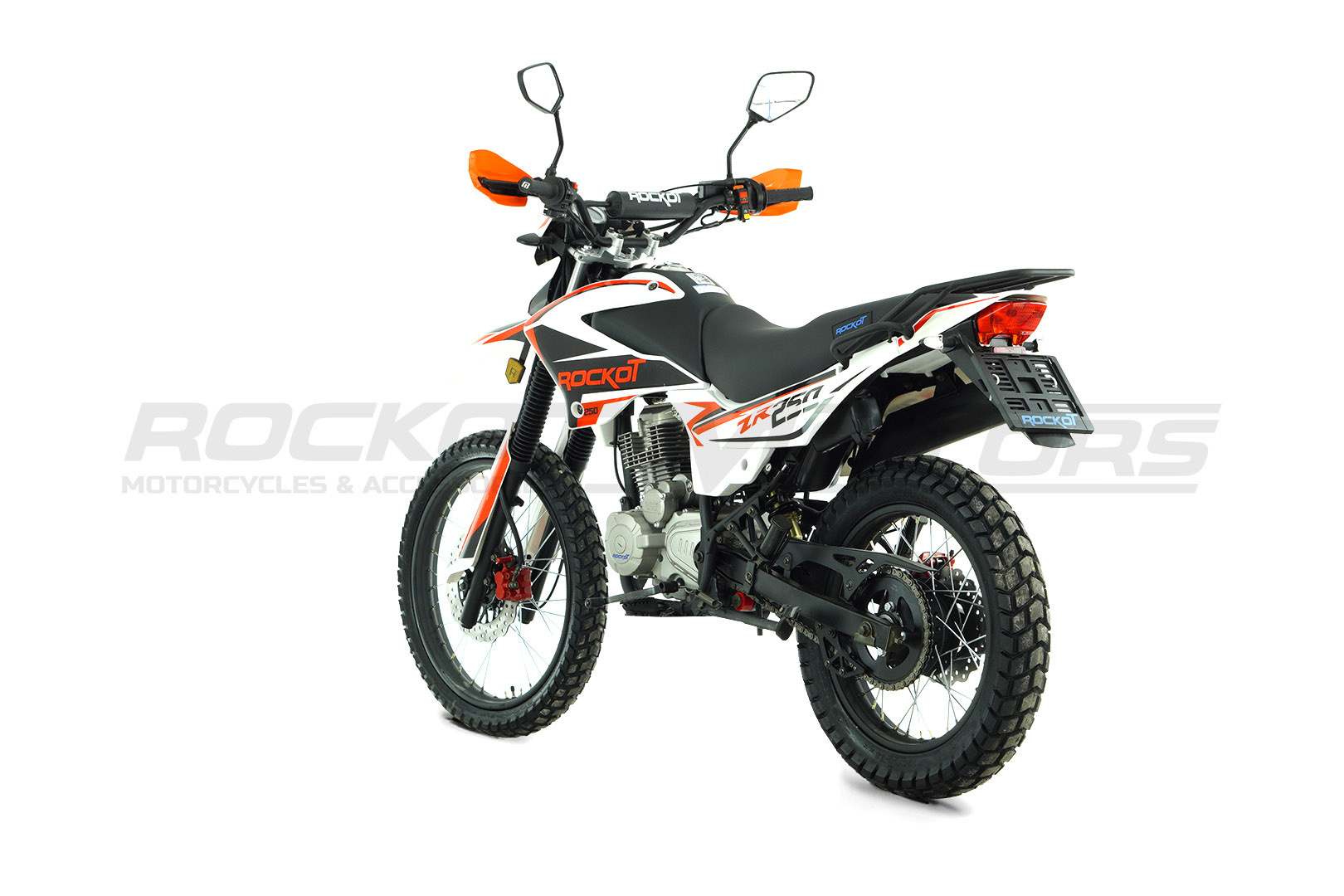 ROCKOT ZR250 выполнен по всем канонам софт-эндуро, а именно: прочный металлический бак, облицовка из мягкого ударопрочного пластика, широкое и комфортное сиденье для водителя и пассажира, а в задней части установлен стальной багажник. Мотоцикл производится в двух вариантах расцветки графики: черно-красной и черно-оранжевой.