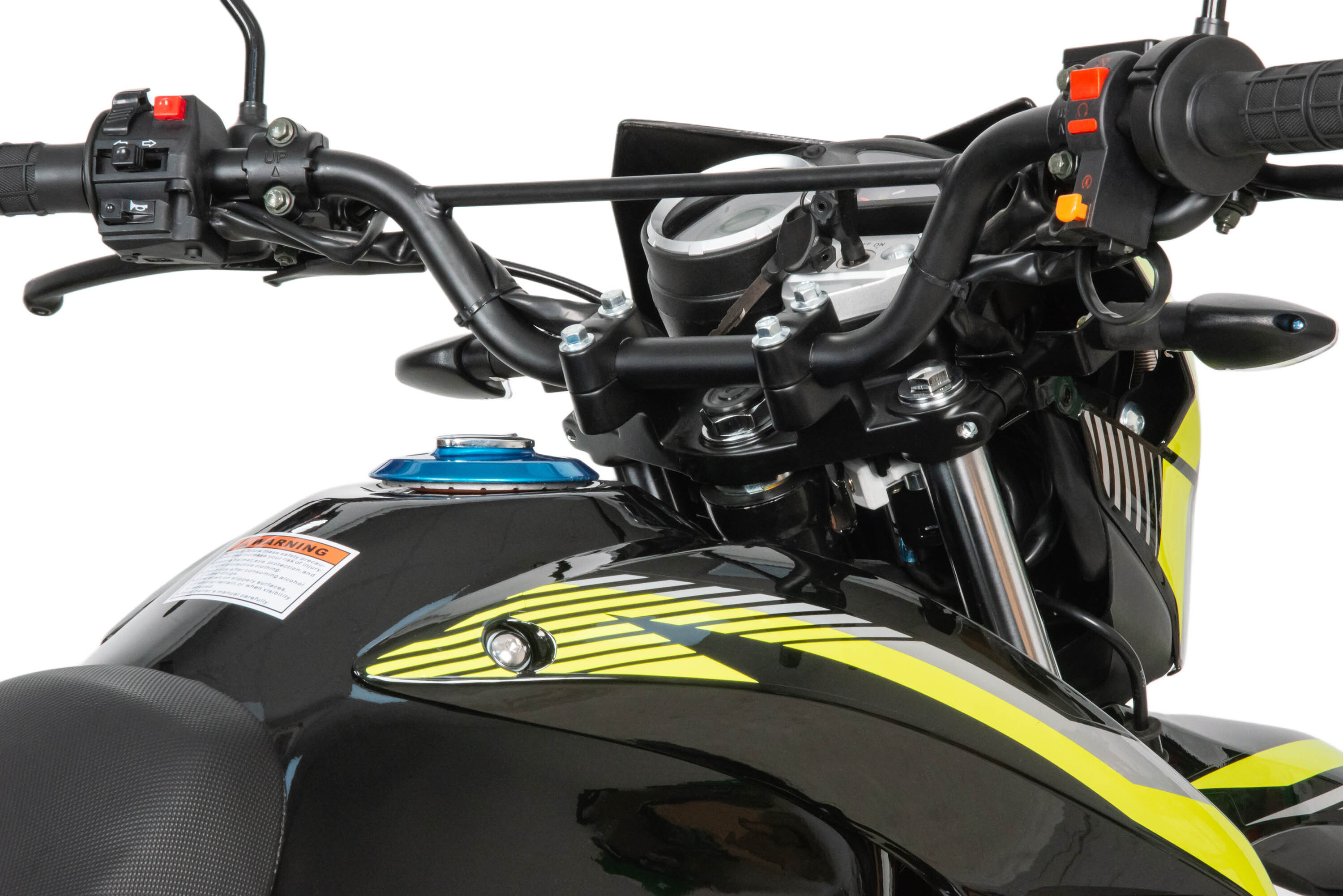 Оборудован обновленной светодиодной линзованной фарой, светодиодными поворотниками и стоп сигналом, блокировкой замка зажигания.