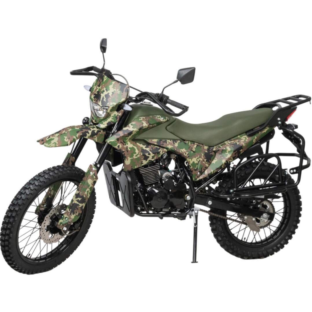 Камуфляжная расцветка подчеркивает брутальный характер мотоцикла, делая его не только функциональным, но и стильным. Это техника, которая выделяется на фоне других и говорит о вашем бесстрашии.