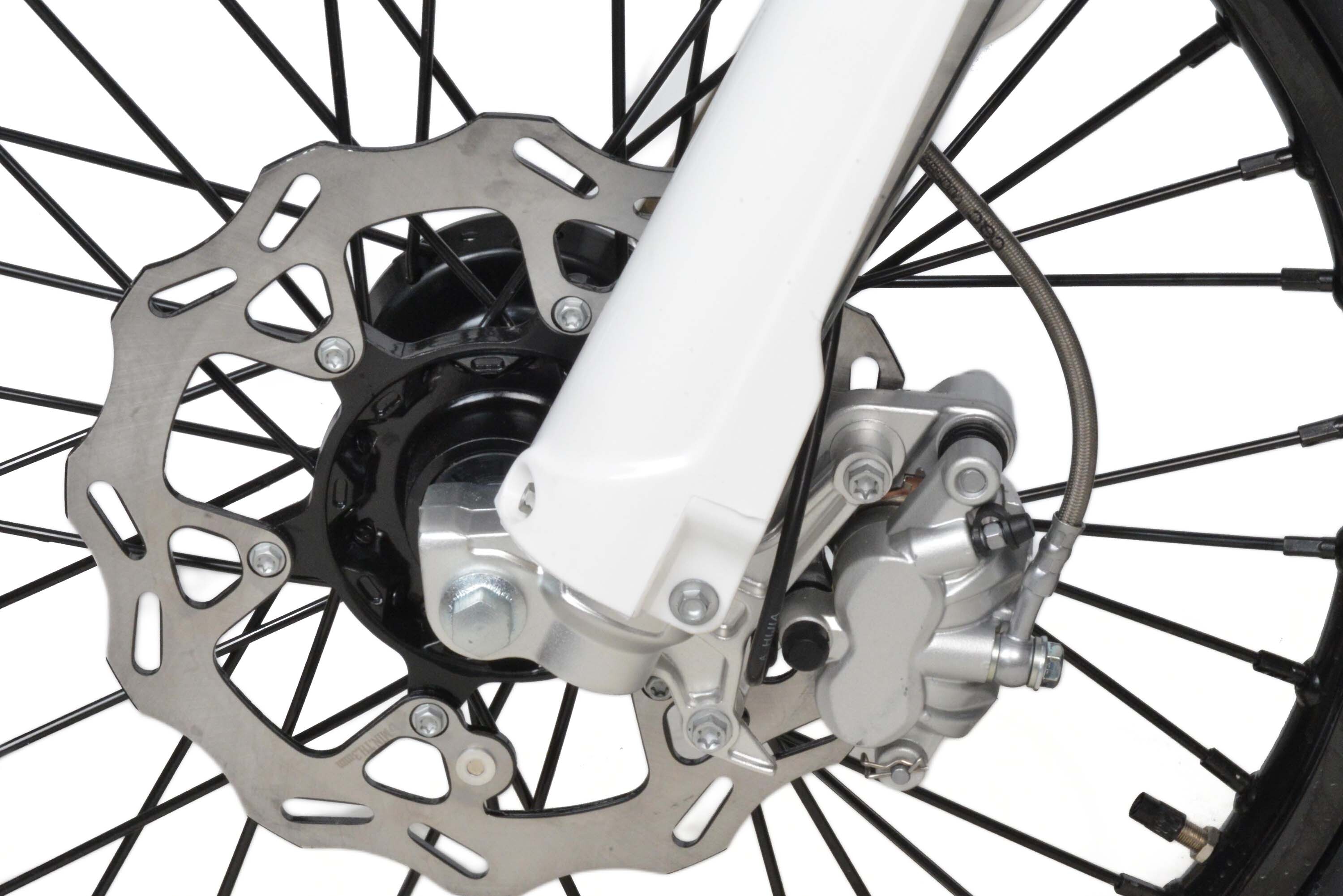 Мотоцикл оснащен усиленными спицами и алюминиевыми ободами, что улучшает прочность колес и устойчивость к ударам при езде по сложным маршрутам.