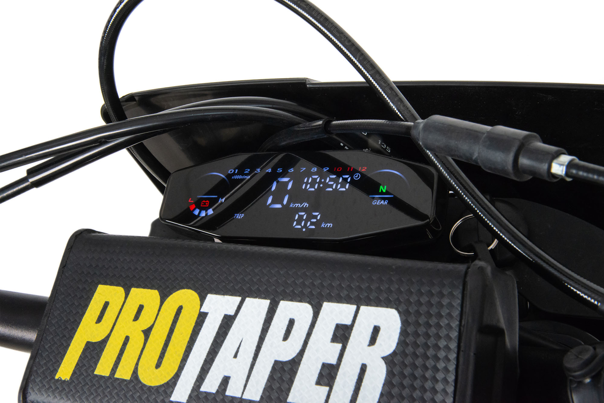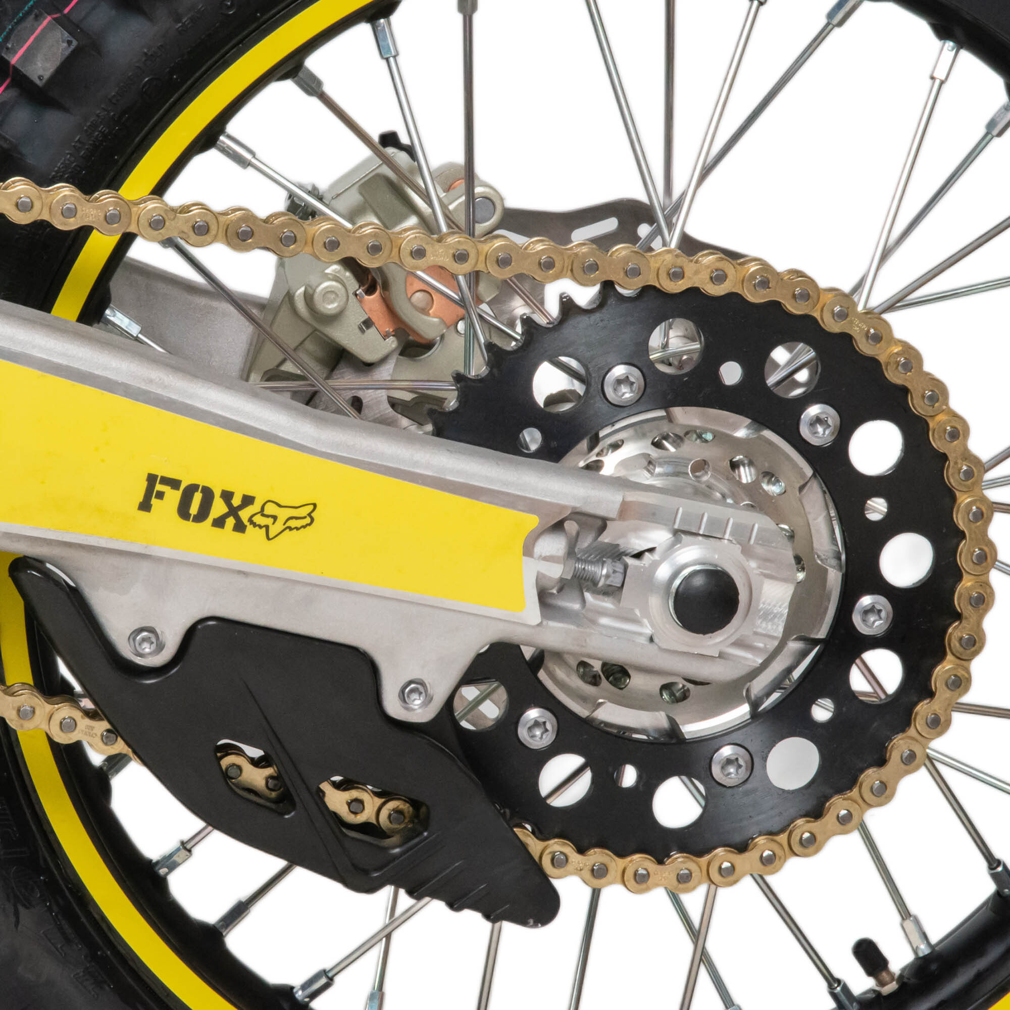 Выхлопная система с резонатором, глушитель алюминиевый. Телескопическая вилка с регулировками перевернутого типа, с усиленными траверсами, позволяет легко преодолевать ямы, ухабы и другие неровности. Задняя подвеска с прогрессией, моноамортизатор с регулировками (с бачком), маятник алюминиевый. Укомплектован: защитой рук, защитой руля, защитой торм. Диска, приборной панелью, светодиодной фарой.