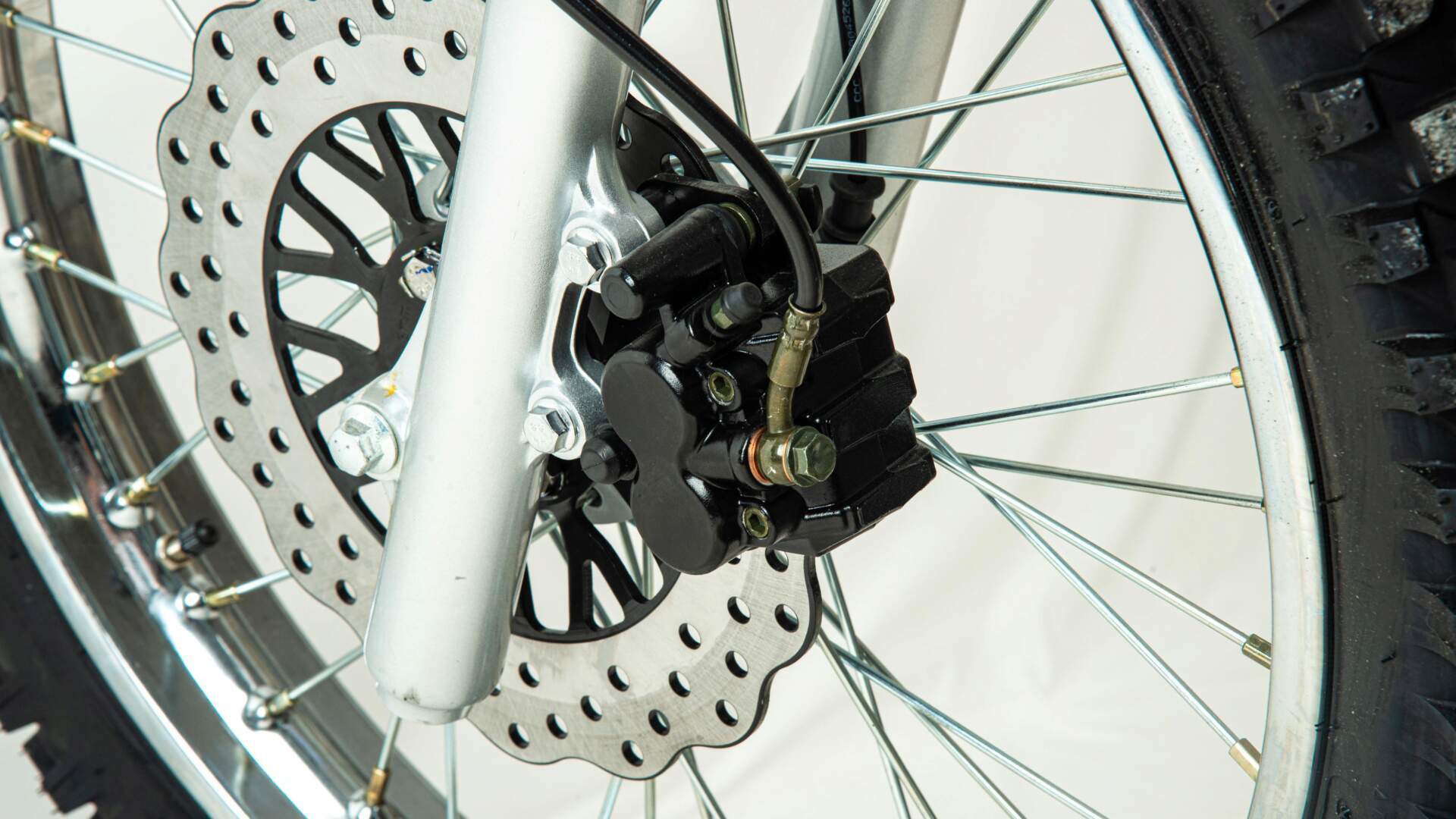 Мотоцикл для мотокросса оснащен надежными передними и задними тормозами с двух и одно поршневыми тормозными суппортами соответственно.