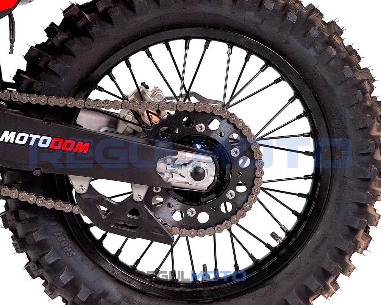 Колеса диаметром 21/18 дюймов собраны на прочных и легких ободьях из алюминиевого сплава марки 7116 и фрезерованных алюминиевых ступицах. В стоке стоит внедорожная резина с увеличенными грунтозацепами «Regulmoto» аналог Mitas 754 размерности 80/100-21 и 120/90-18. Для комфортного передвижения по асфальтированным дорогам понадобится комплект мотардовых покрышек или колеса с такой резиной в сборе. Среди других комплектующих Regulmoto Holeshot необходимо отметить следющие: