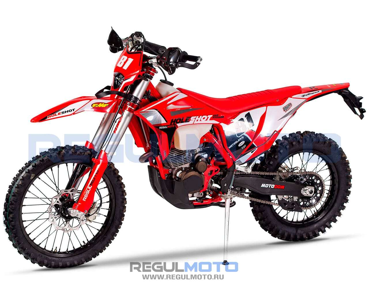 "Regulmoto Holeshot Red Edition – новинка модельного ряда мототехники Regulmoto, байк двойного назначения с достаточно мощным 4-тактным двигателем воздушного охлаждения 4 клапана, который способен проявить себя как на дорогах с покрытием (у мотоцикла есть ПТС), так и на бездорожье.Отличительной особенностью модели стала комплектация мотоцикла двигателем Zongshen ZS172MN-5 4 клапана на цилиндр с коробкой на шесть передач. Такое решение позволило добиться большей отдачи мощности и крутящего момента в диапазоне низких оборотов, что немаловажно для внедорожной мототехники. А наличие балансирного вала сводит к минимуму уровень вибраций, делая эксплуатацию мотоцикла на дорогах общего пользования максимально комфортной.