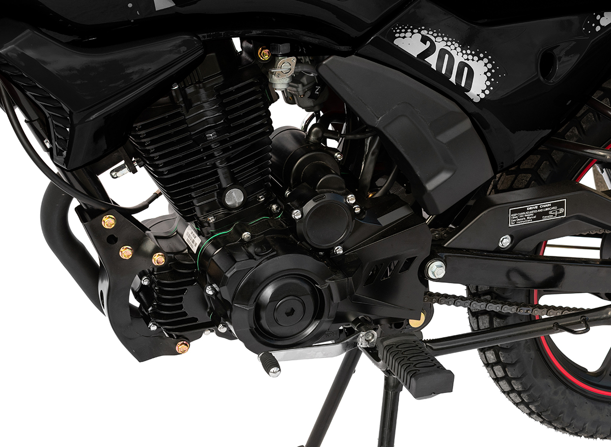 В раме мотоцикла с 18-дюймовыми колесами на литых дисках установлен 4-тактный 200-«кубовый» двигатель с воздушным охлаждением, который способен развивать максимальную мощность в 13,6 лошадиных сил. Наличие у двигателя балансирного вала способствует снижению вибрации при работе мотора. 5-ступенчатая трансмиссия, электростартер, полноценная подвеска, представленная телескопической вилкой спереди и двумя амортизаторами и маятником сзади, цифровая приборная панель и емкий топливный бак – все это позволит получать максимум удовольствия от поездки. За безопасность использования мотоцикла Regulmoto SK200-9 отвечают надежная тормозная система (дисковый тормоз спереди и барабанный сзади), комплект светового оборудования и зеркал заднего вида.