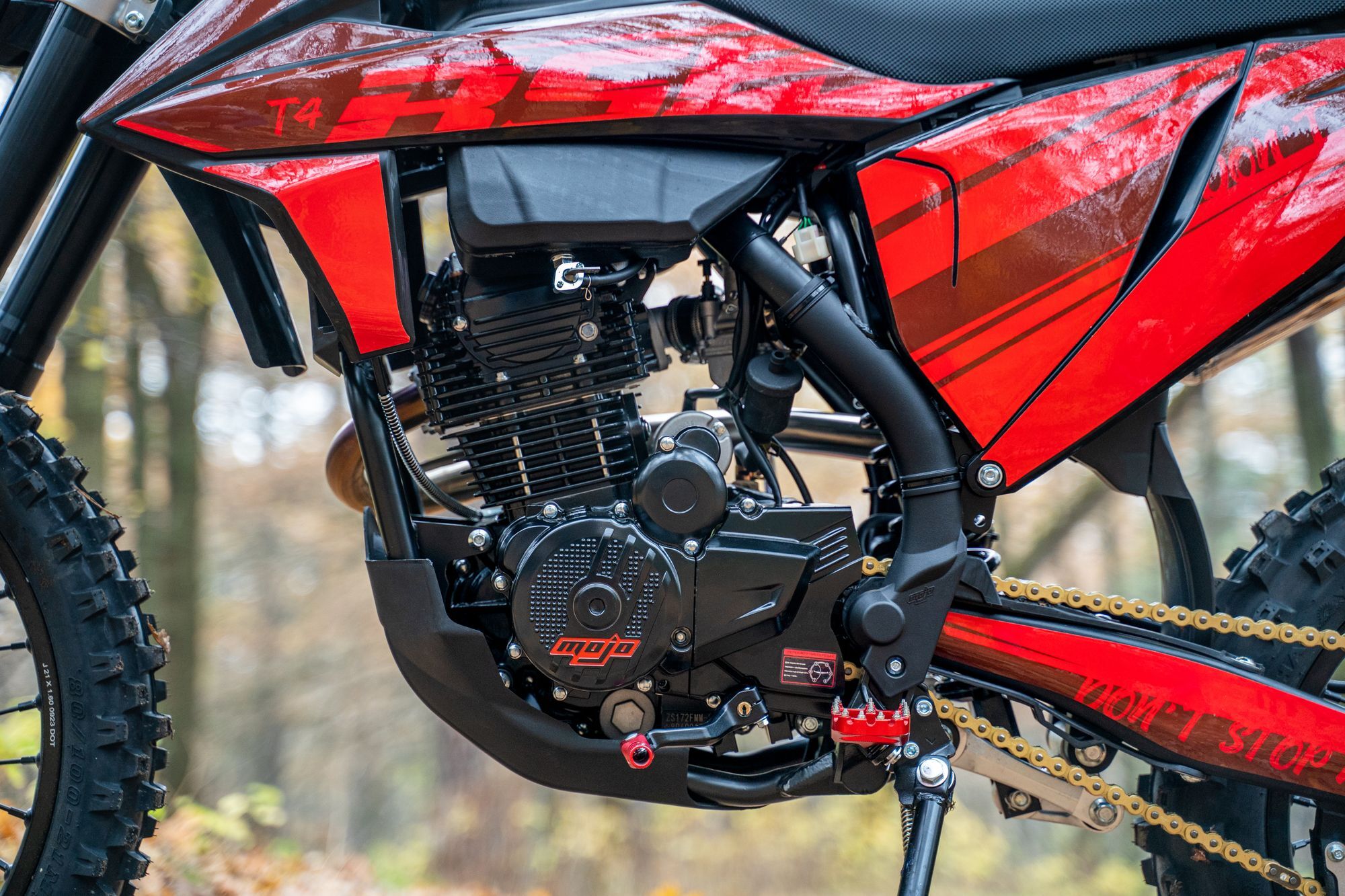 Одноцилиндровый 4-тактный двигатель воздушного охлаждения Zongshen ZS172FMM-5 имеет объём 250 см3 и выдаёт 21 л.с., Балансирный вал максимально снижает уровень вибраций, что помогает с комфортом развивать скорость и с лёгкостью преодолевать трассы со сложным рельефом. Карбюратор NIBBI PE30 обеспечивает бесперебойную работу техники в самых жестких условиях эксплуатации, простоту и лёгкость в обслуживании, а также неприхотливость к качеству топлива. Мотоцикл оснащён 5-ступенчатой механической коробкой передач с классической схемой “1-N-2-3-4-5”.