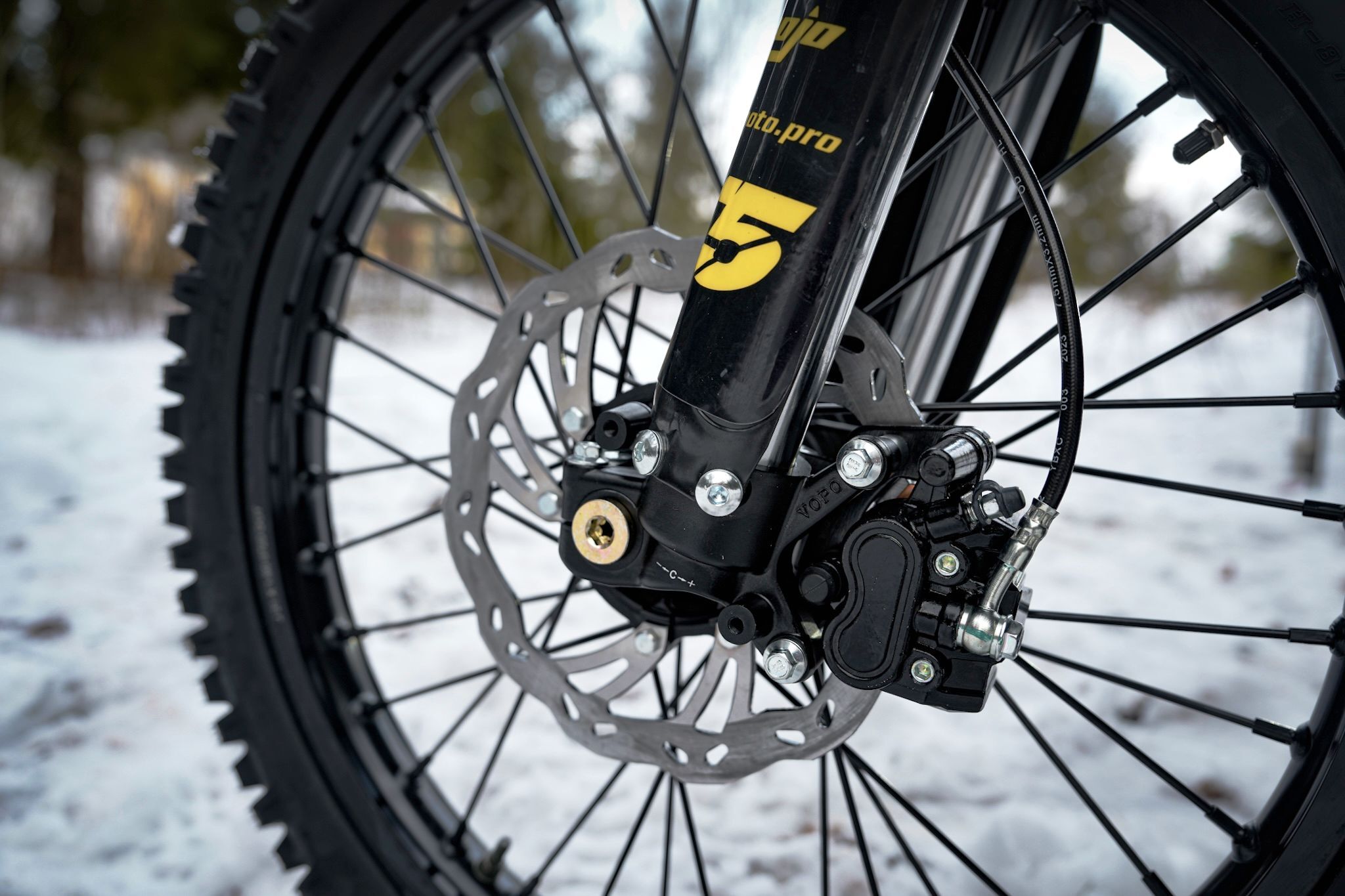 На T5 установлен топливный бак на 6,5 л, мощная тормозная гидравлическая система с дисками диаметром 240 мм, звезды 13t – 49t, «зубастые» покрышки Carrystone 80/100-21 спереди и 110/90-18 сзади. Мотоцикл оснащается полностью светодиодной фарой головного света, грипсами и ручкой газа Nibbi Racing, цепкой шкуркой сиденья и защитой переднего тормозного диска.