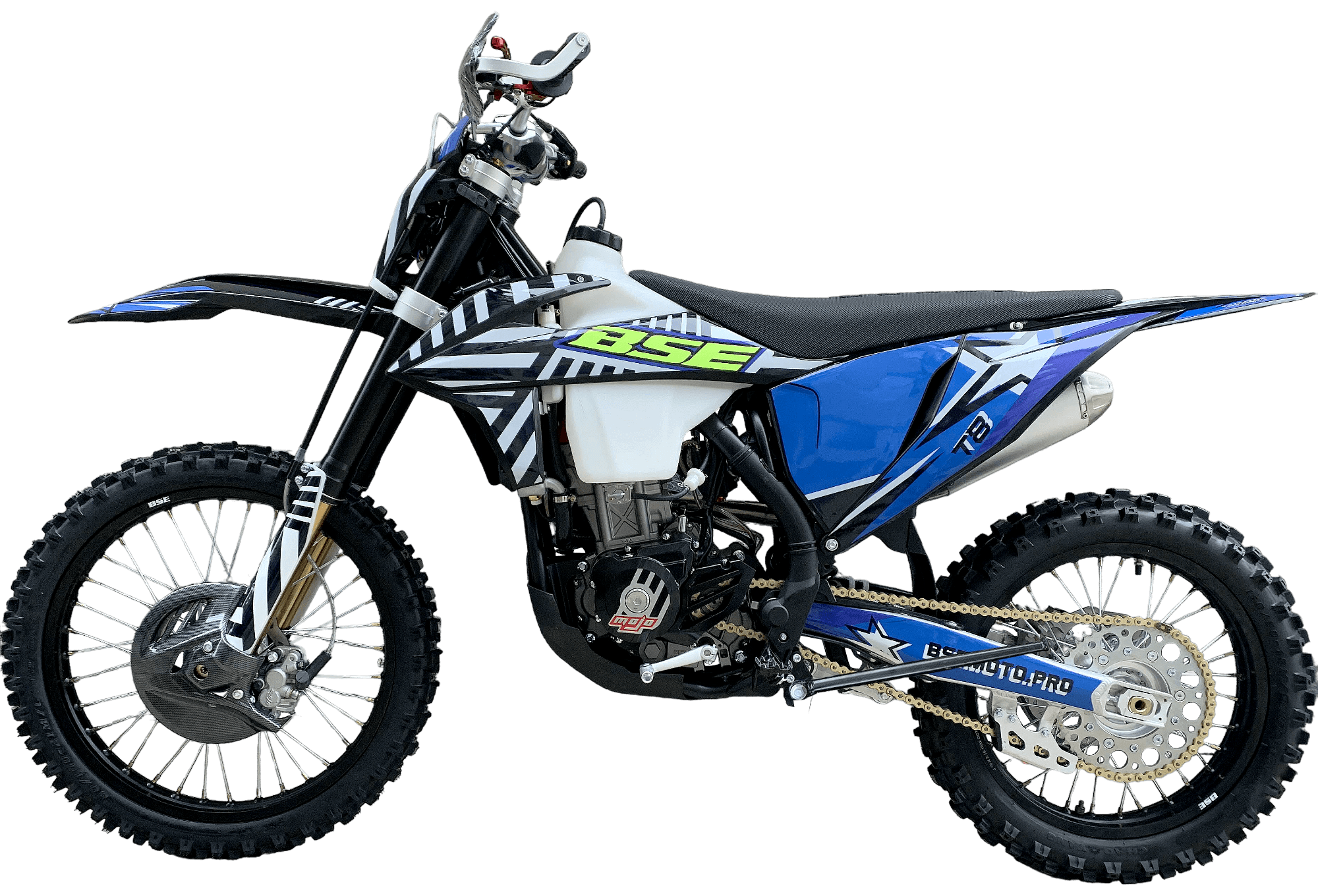 Разработка подвески BSE Mojo Racing производилась опытными инженерами-подвесочниками завода, а настройка — под чутким контролем заводской спортивной китайской командой BOSUER. Спереди установлена полностью регулируемая вилка «перевертыш» BSE Mojo Racing c перьями диаметром 53/58.5 мм, 930 мм. Сзади установлен полностью настраиваемый моноамортизатор BSE Mojo Racing 480 мм.