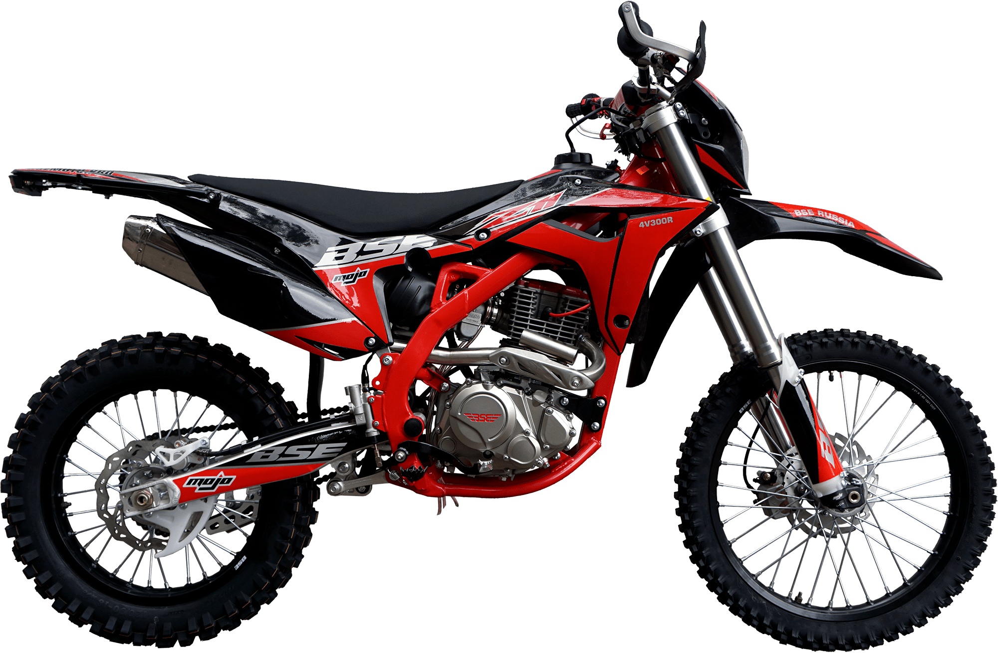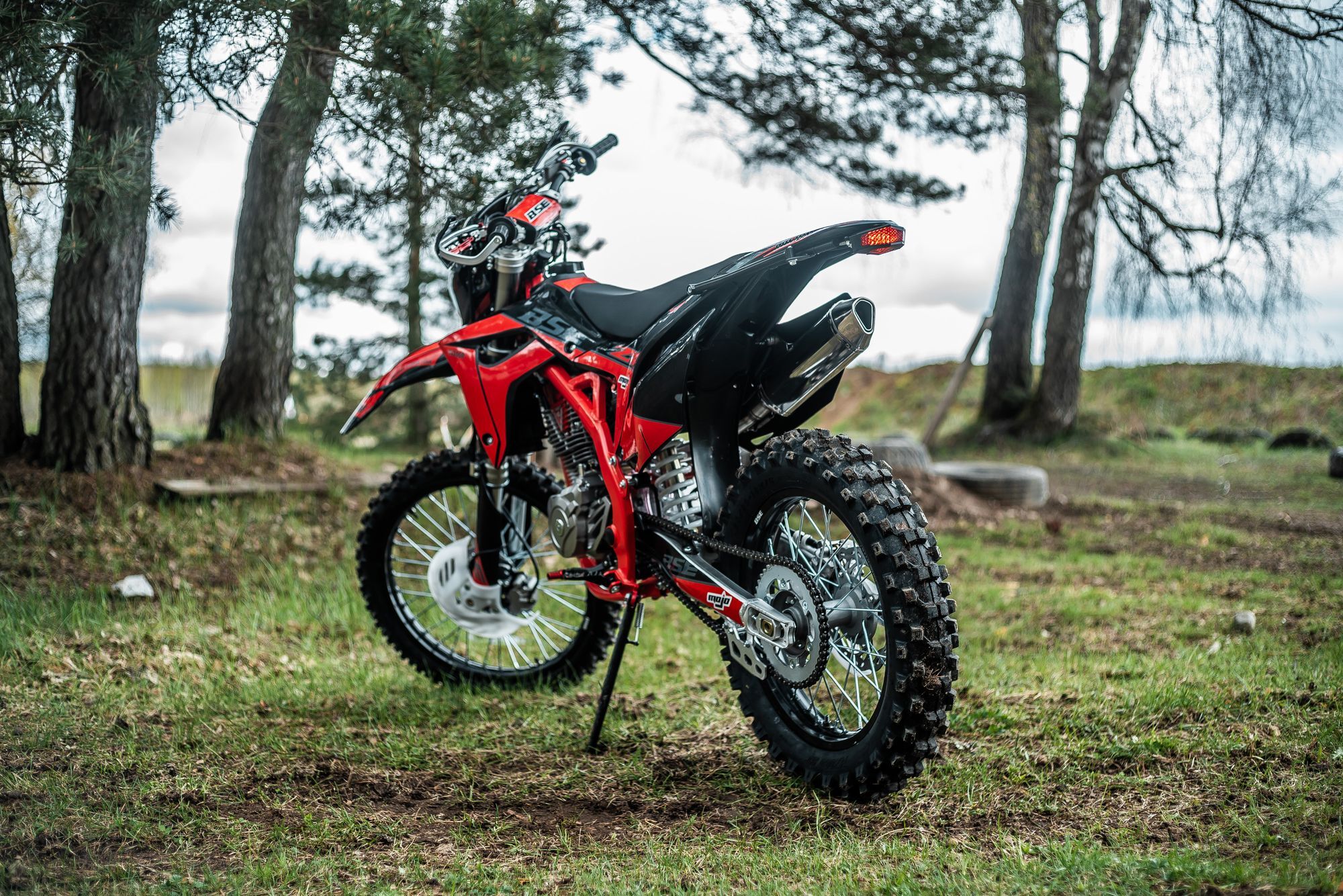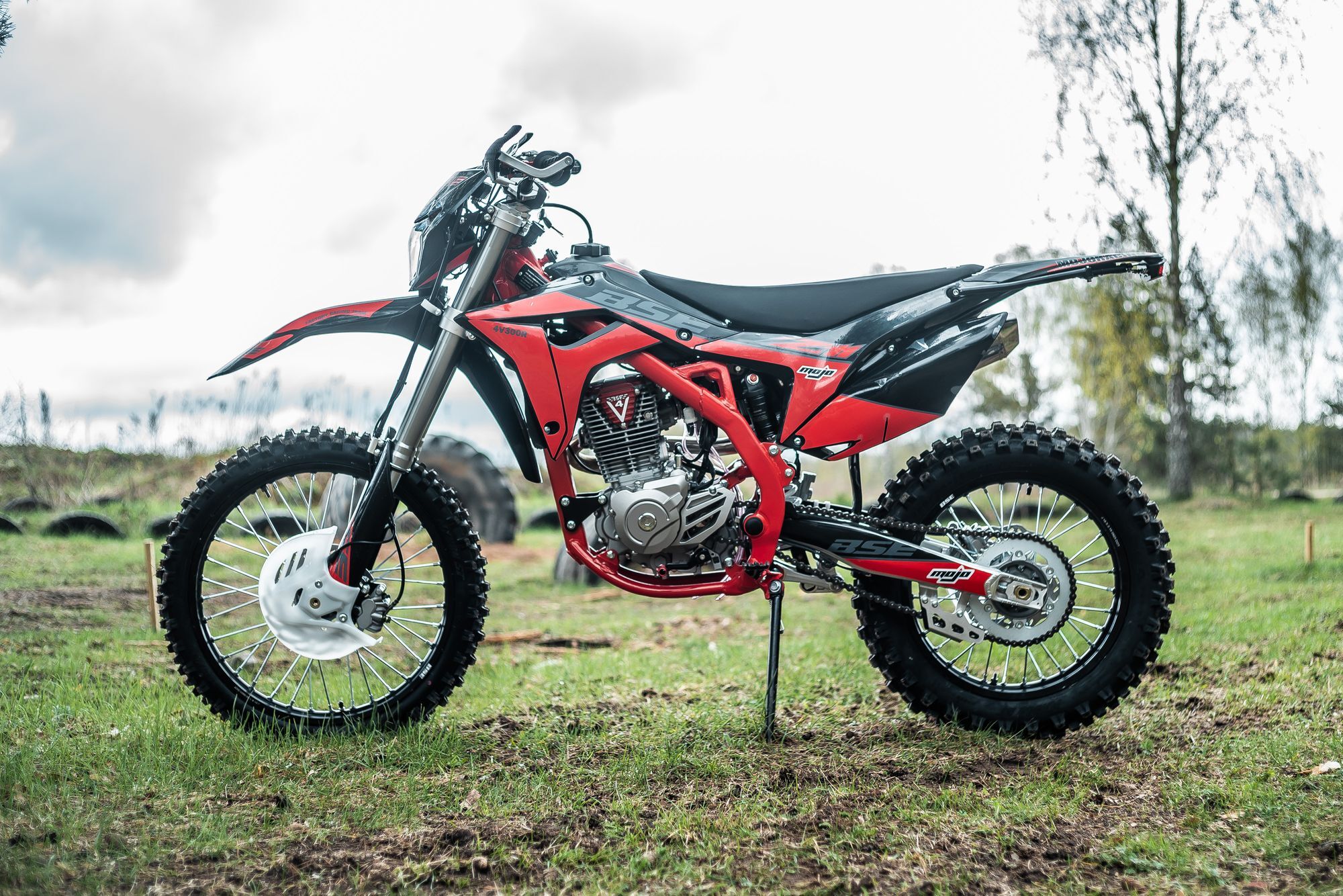 На мотоцикле установлены: усиленные легкосплавные колёсные диски MOJO, усиленная цепь, датчик моточасов, усиленные траверсы, складные СNC рычаги тормоза и сцепления, защита коллектора. Мощная гидравлическая тормозная система Mojo Racing остановит байк в любых условиях.