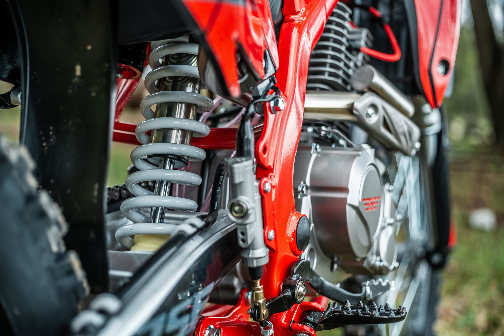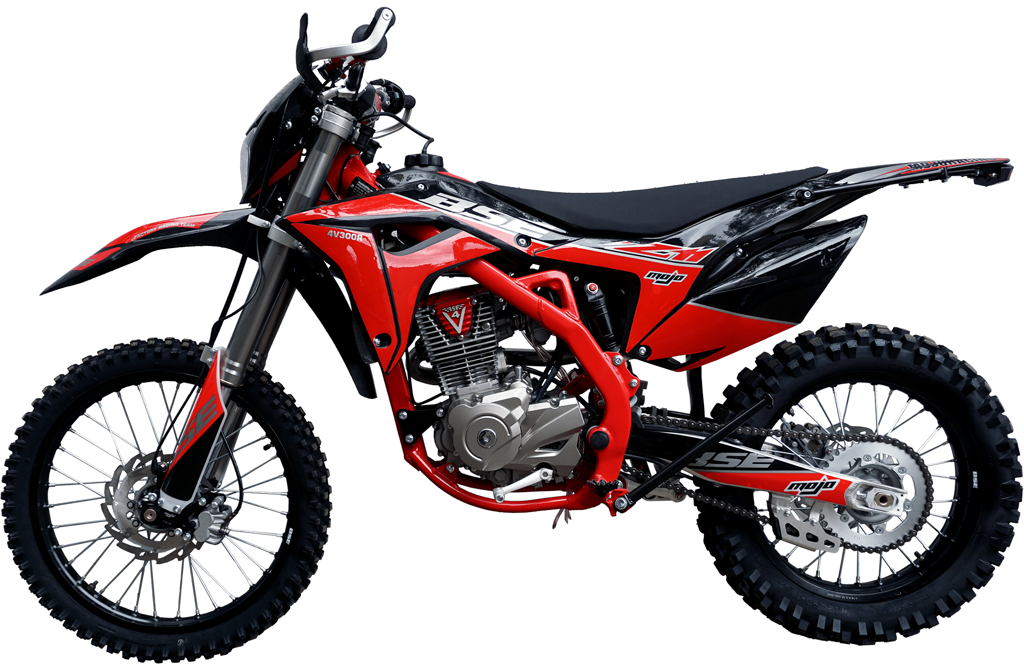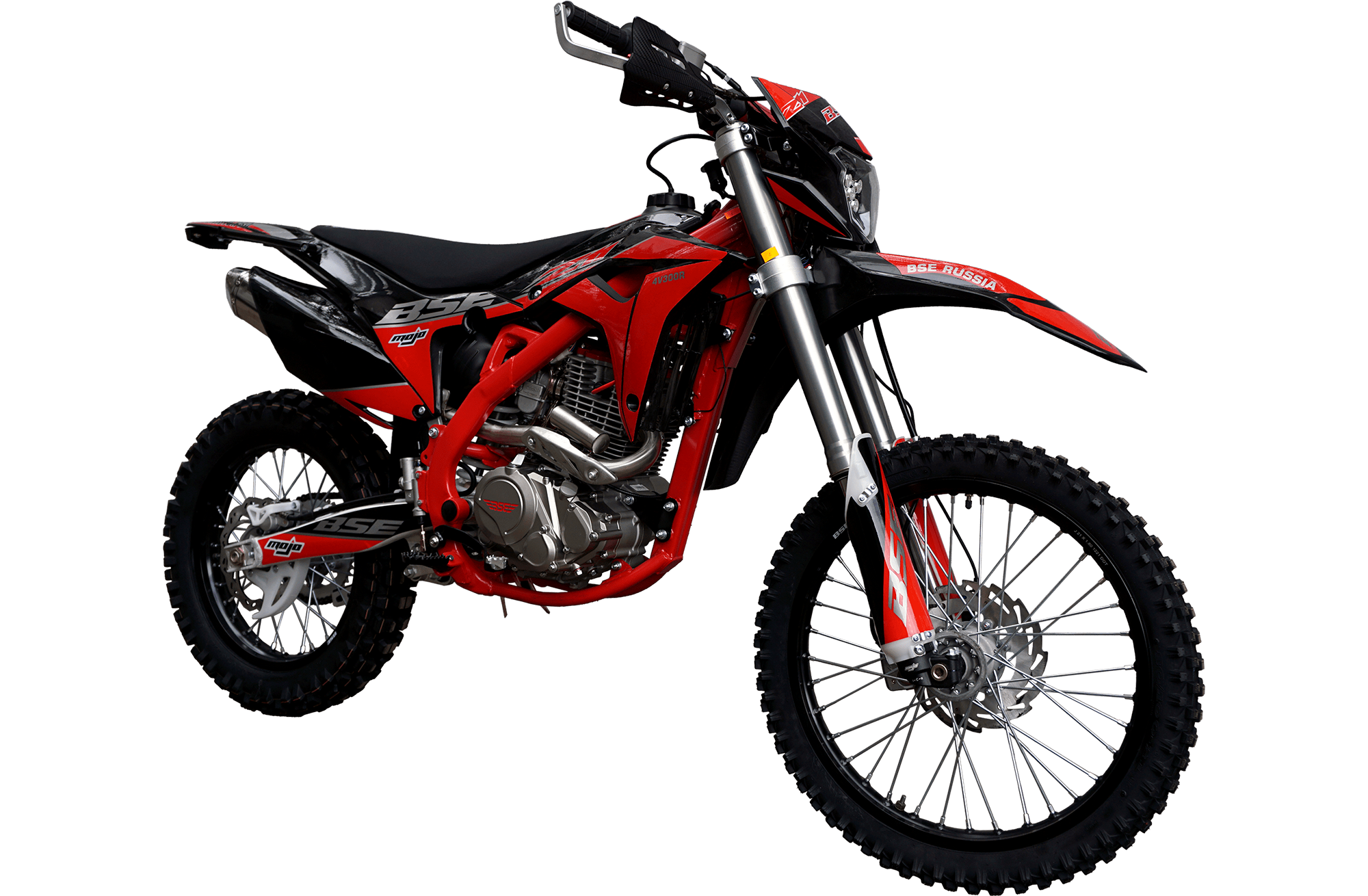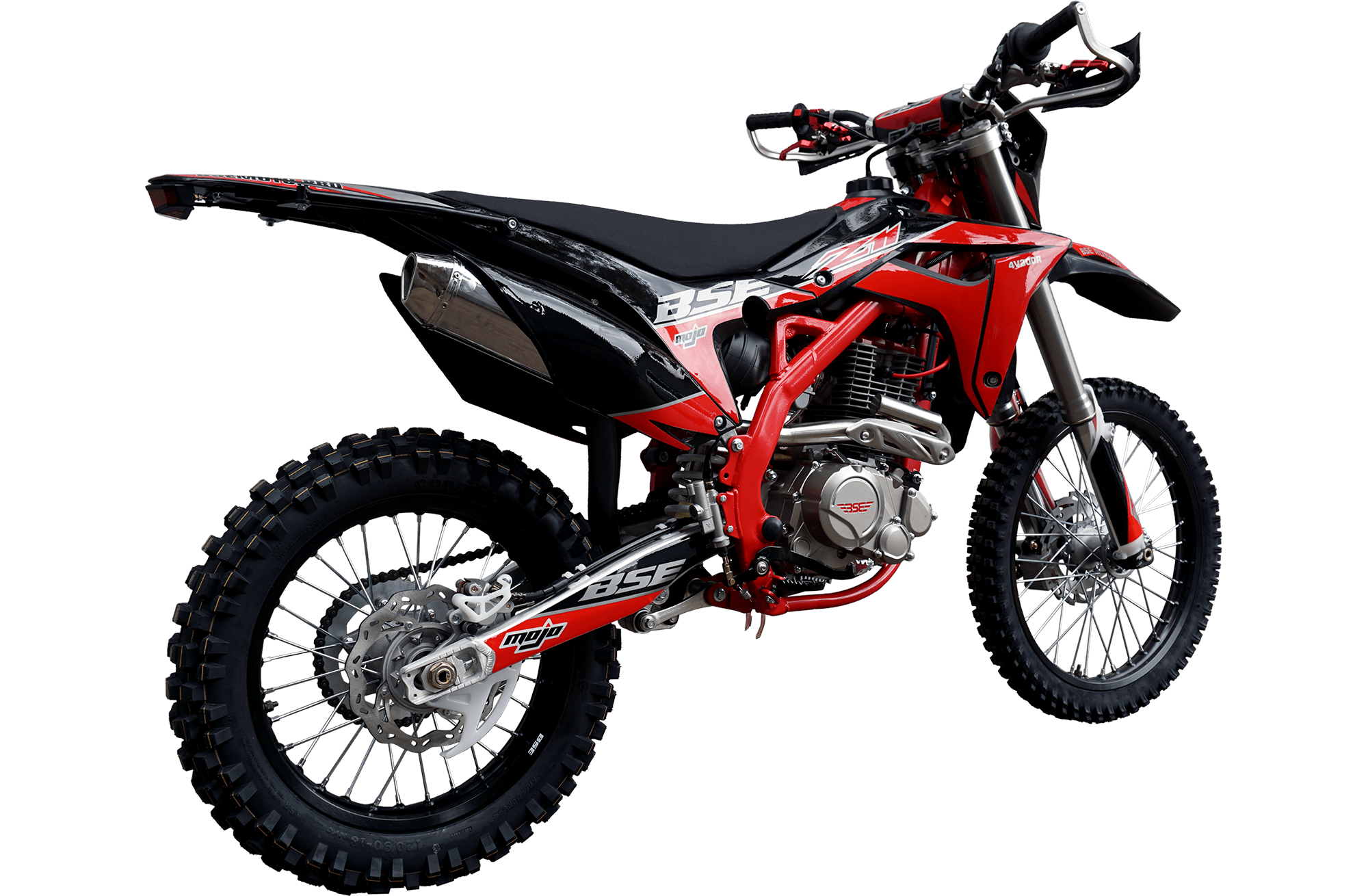 На мотоцикле установлены: усиленные легкосплавные колёсные диски MOJO, усиленная цепь, датчик моточасов, усиленные траверсы, складные СNC рычаги тормоза и сцепления, защита коллектора. Мощная гидравлическая тормозная система Mojo Racing остановит байк в любых условиях.