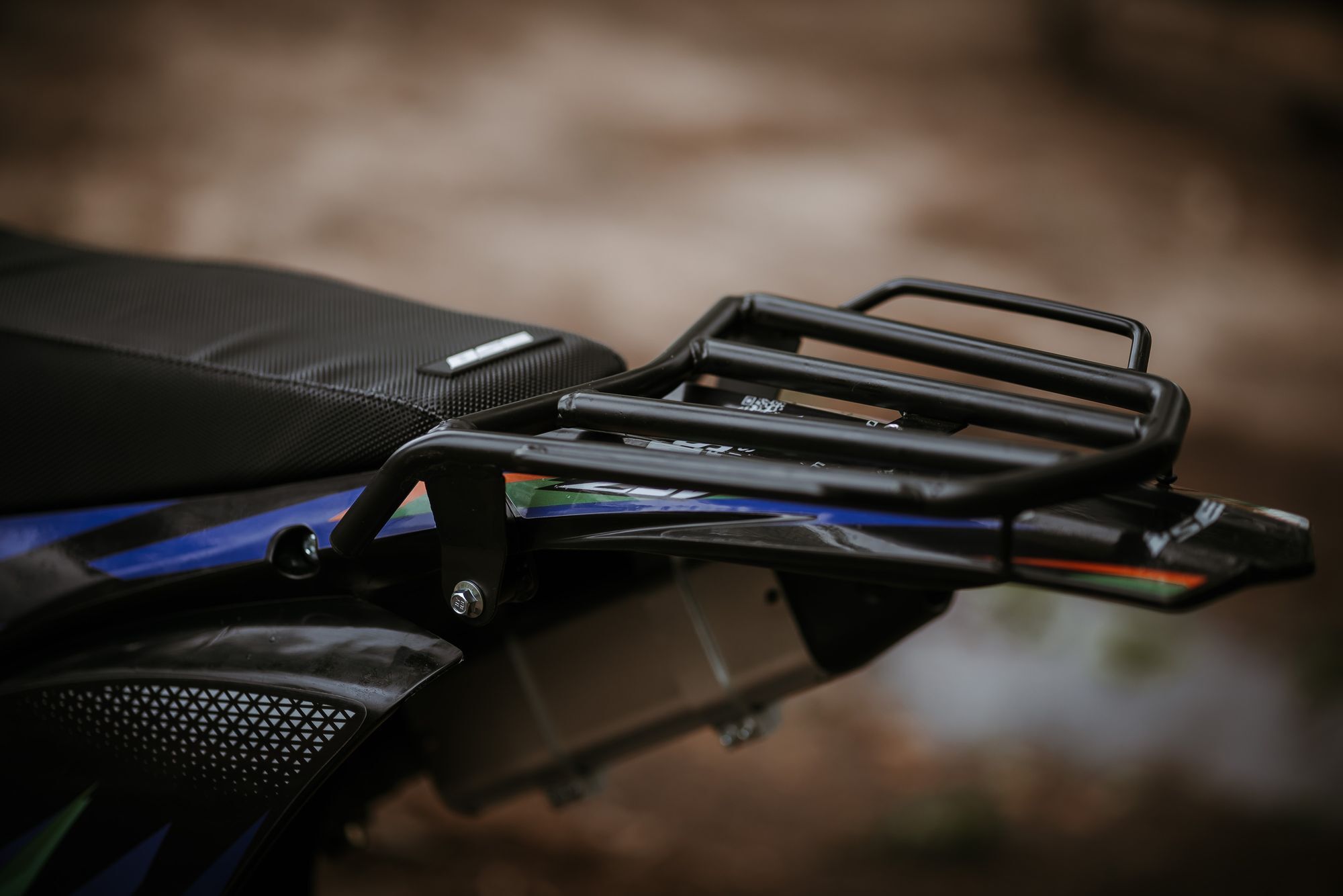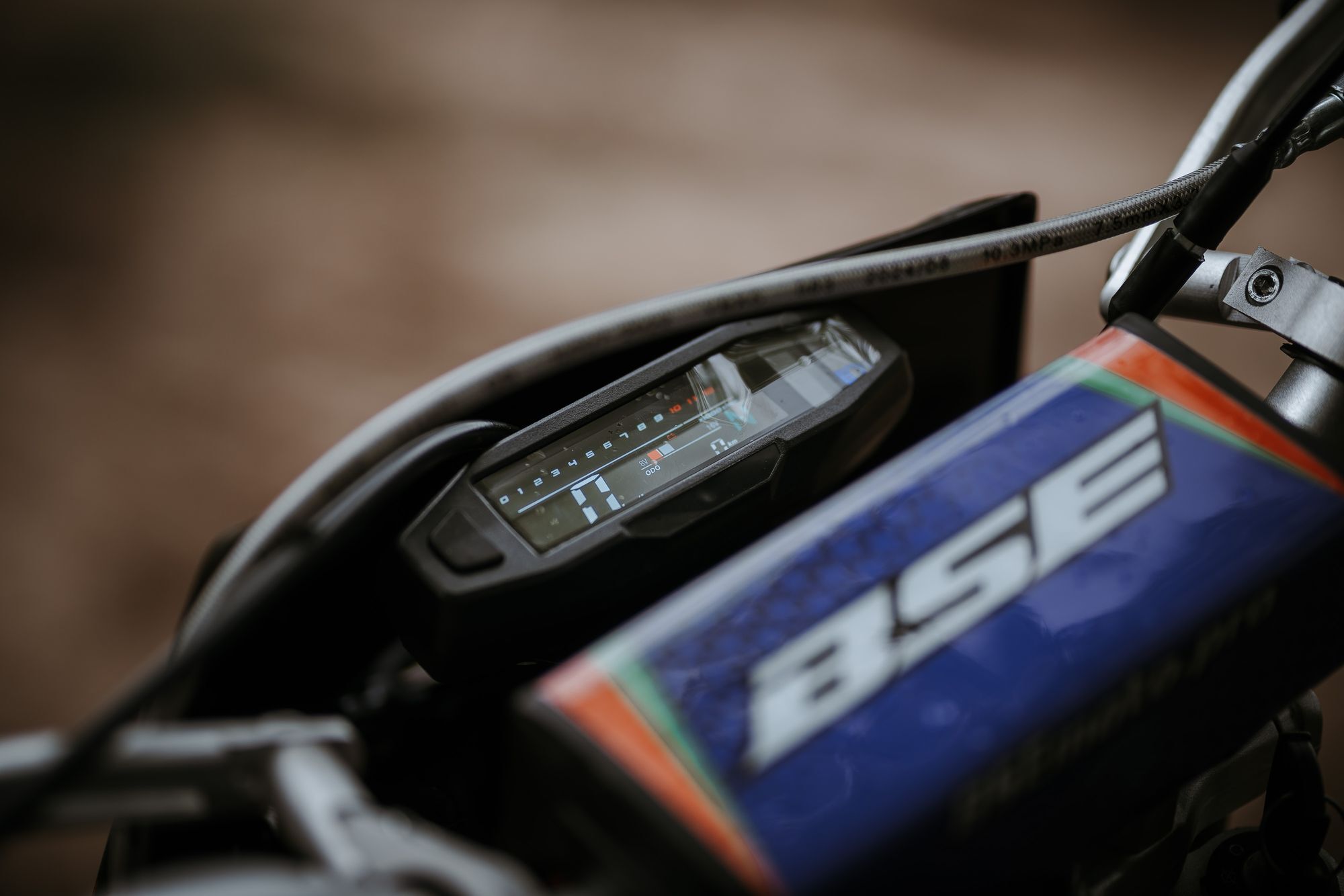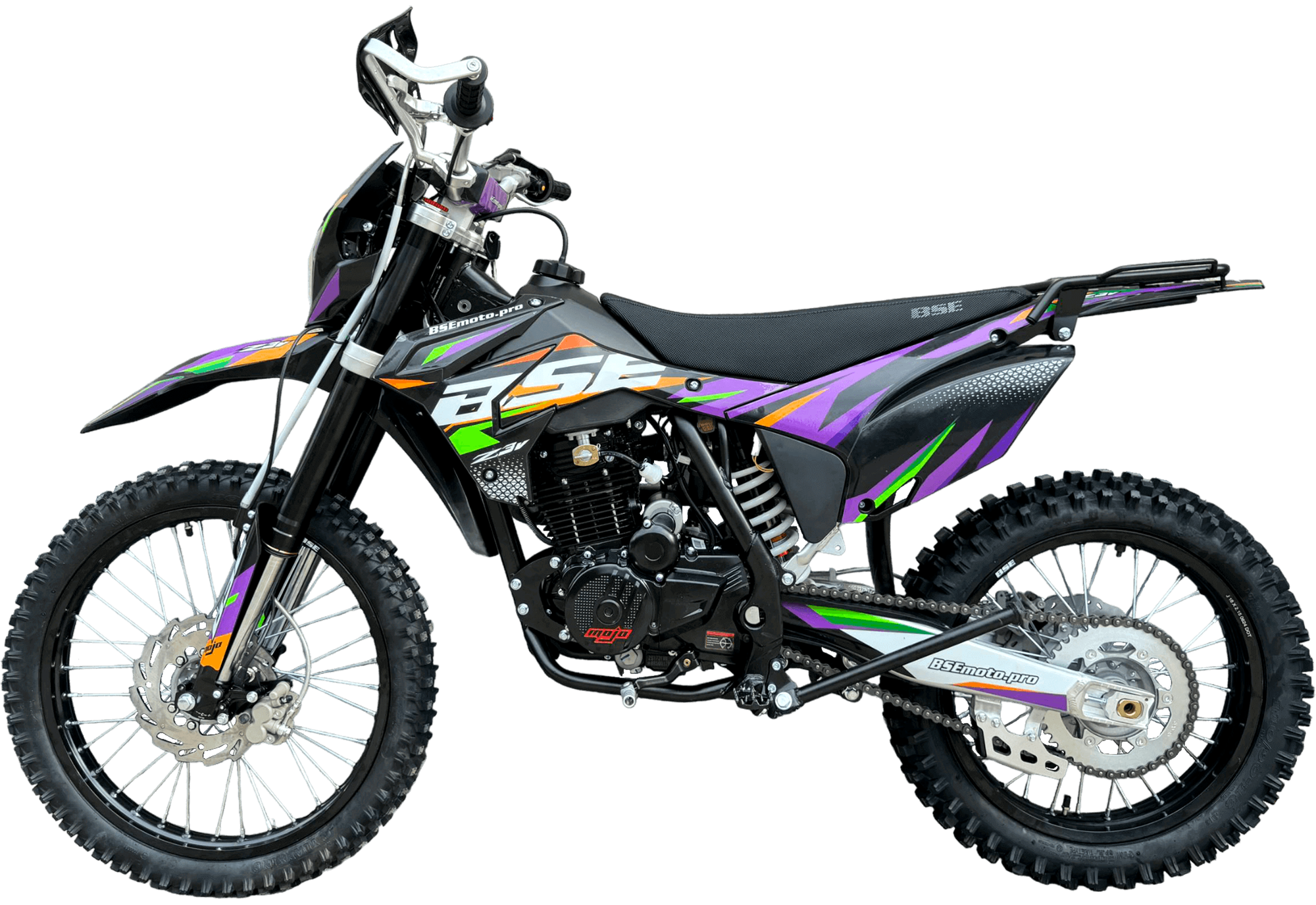 Комфорт. Его на BSE Z3 V в избытке: полностью светодиодная фара головного света с 5 модулями и полоской дневного хода, задний стоп-сигнал, USB зарядка, электростартер, удобное сиденье, широкий спортивный алюминиевый руль. Благодаря ЖК приборной панели и датчику моточасов вы всегда будете знать о всех главных параметрах мотоцикла. Металлическая зашита рук, задний багажник, буксаторы на усиленных ободах. Z3 V 21/18 в стандарте обут в «зубастые» покрышки Yanxing, спереди: 80/100- 21, сзади: 110/90 -18. Z3 V точно не спасует в условиях серьезного бездорожья.