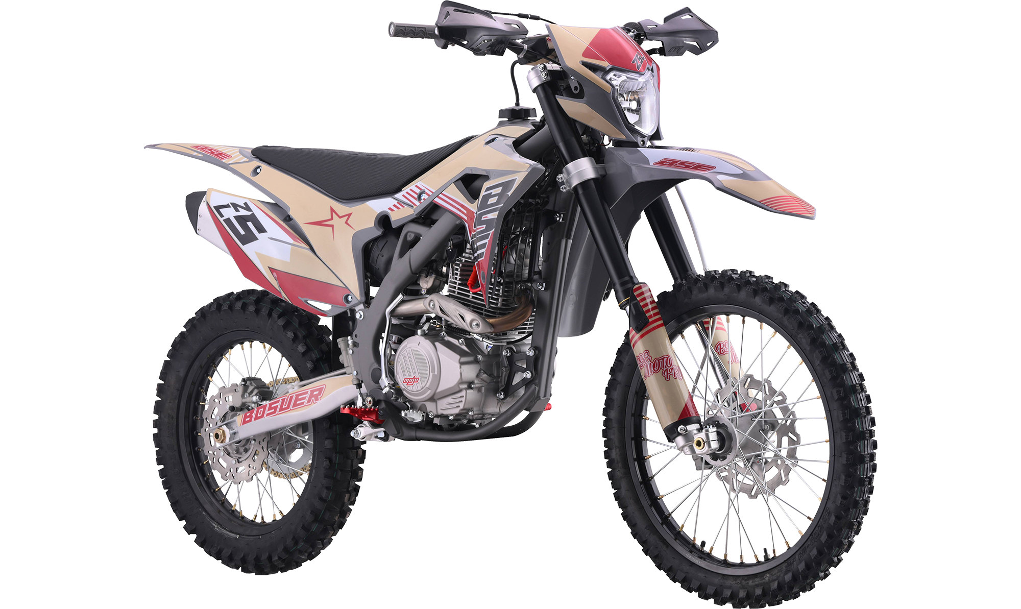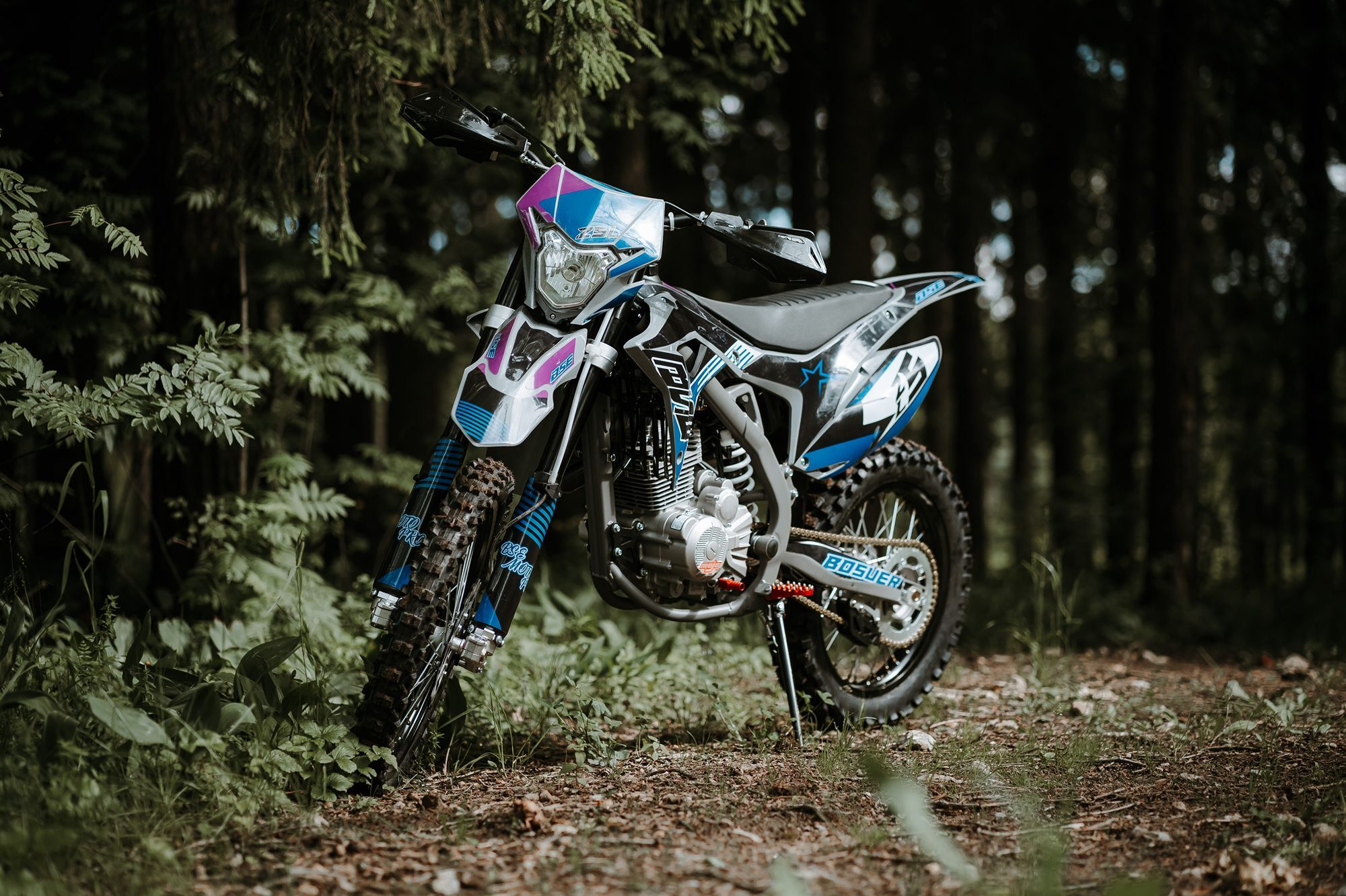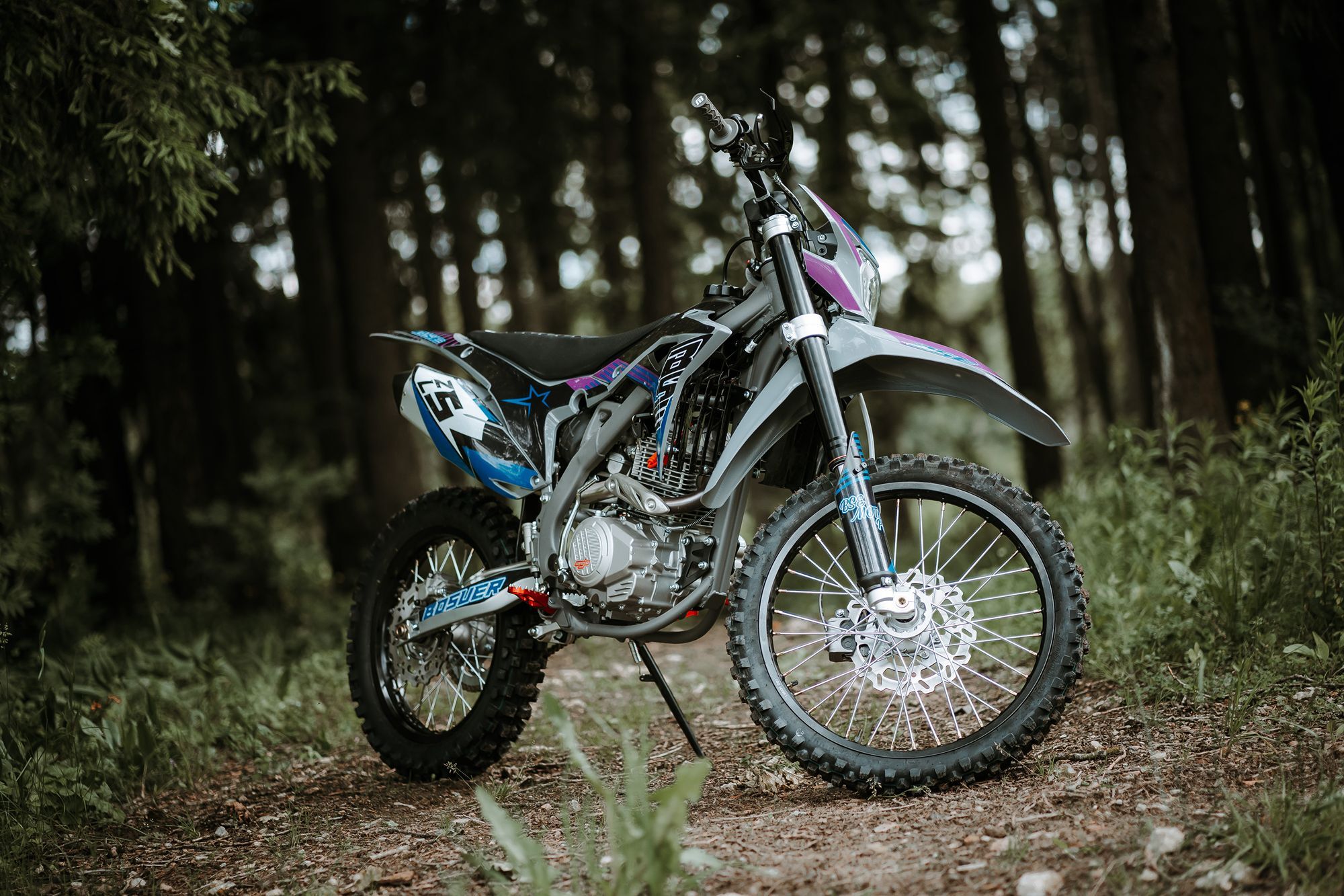 За основу мы взяли успешный полноразмерный Z5 и упростили комплектацию, чтобы сделать максимально привлекательный прайс, оставив главные компоненты — надежный 250-кубовый мотор Zonsen и усиленную стальную раму Bosuer. В итоге получили полноразмерный, функциональный и мощный эндуро мотоцикл. Идеально сбалансированный, устойчивый и готовый прощать ошибки при езде.