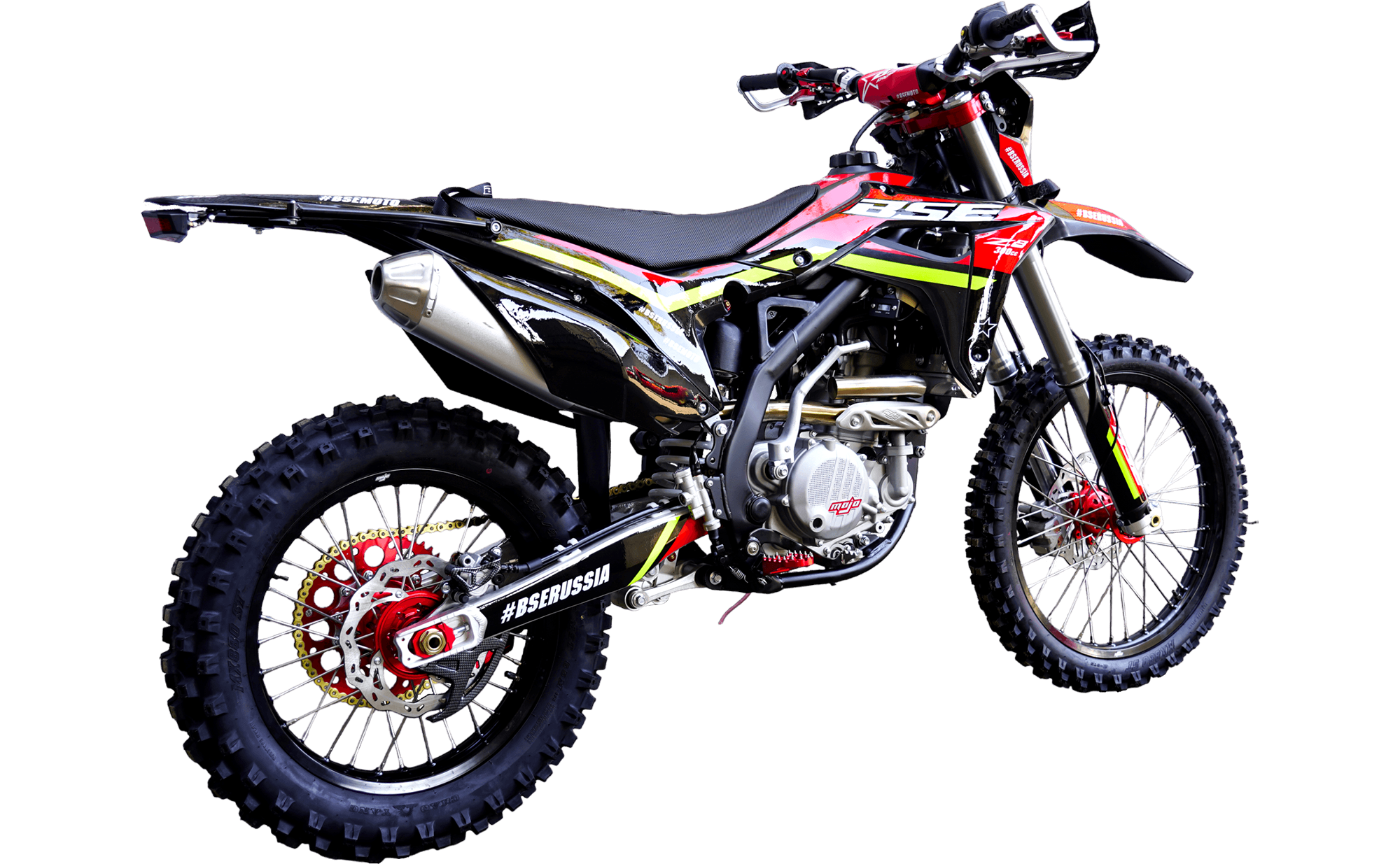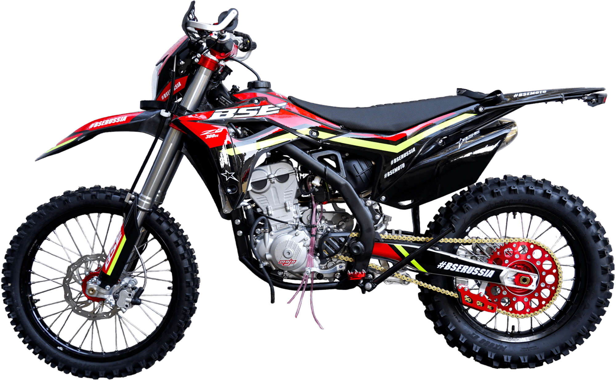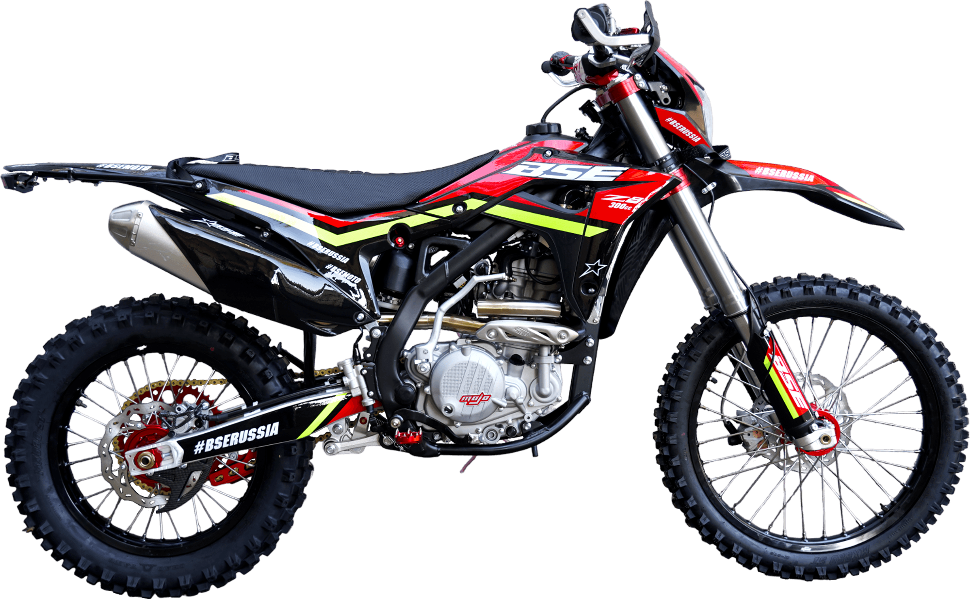 BSE Z8 комплектуется: новейшим мощным 300 кубовым двигателем ZONGSHEN с балансирным валом; спортивным карбюратором Nibbi Racing; профессиональной полностью регулируемой подвеской BSE MOJO Racing; практичной резиной CHAOYANG; диодными осветительными приборами; анодированными деталями и новой агрессивной черно-красной расцветкой.