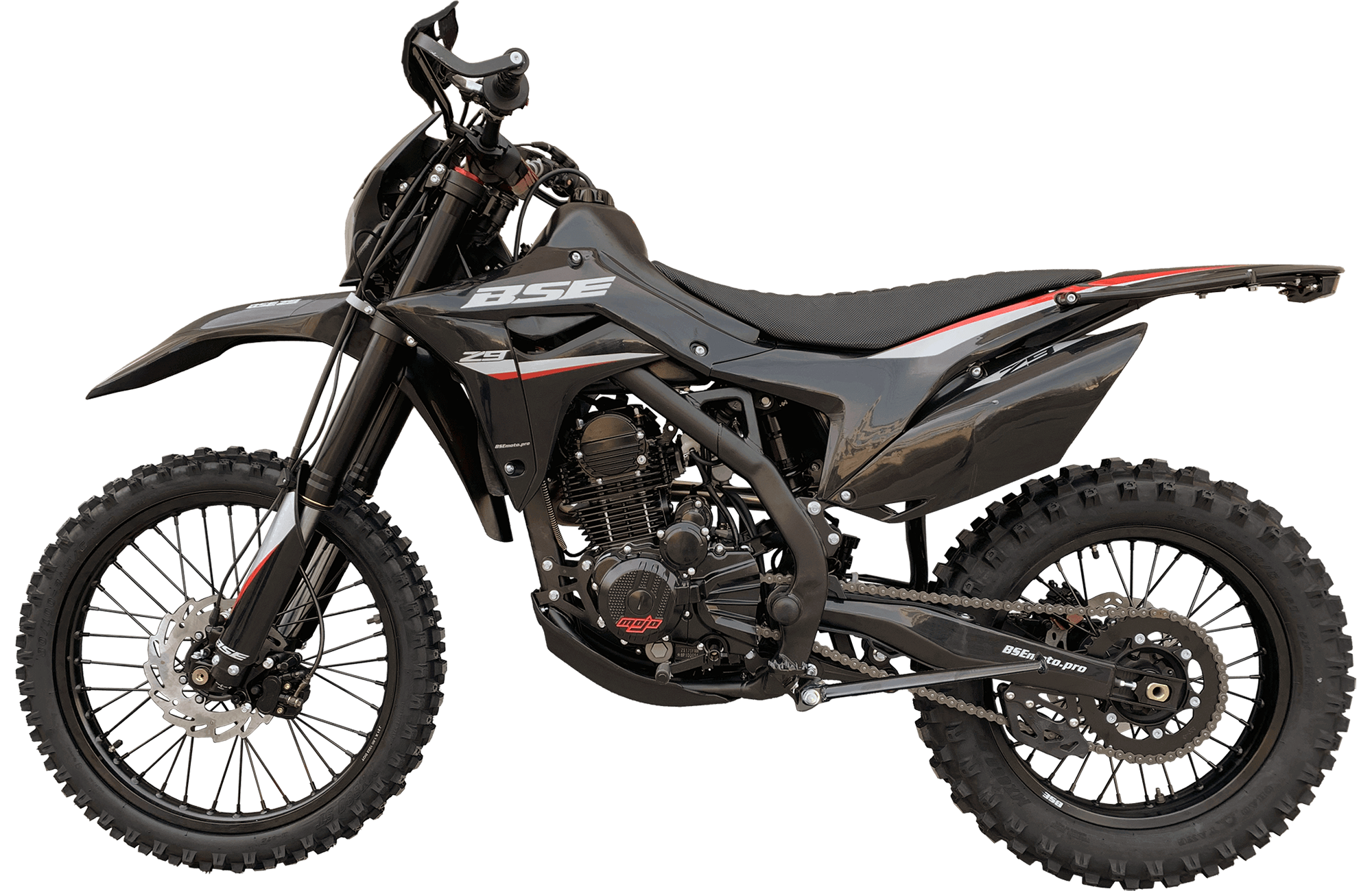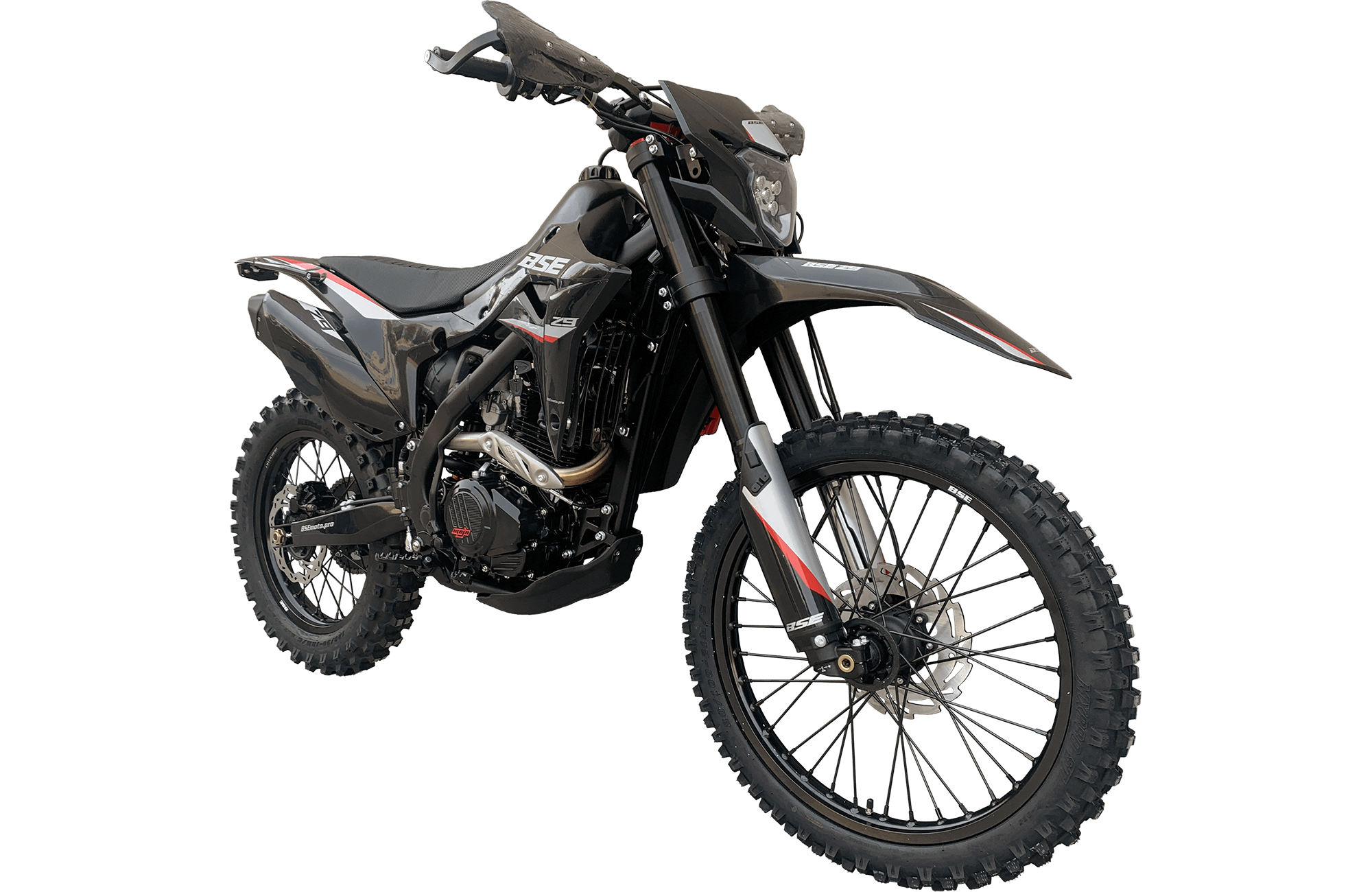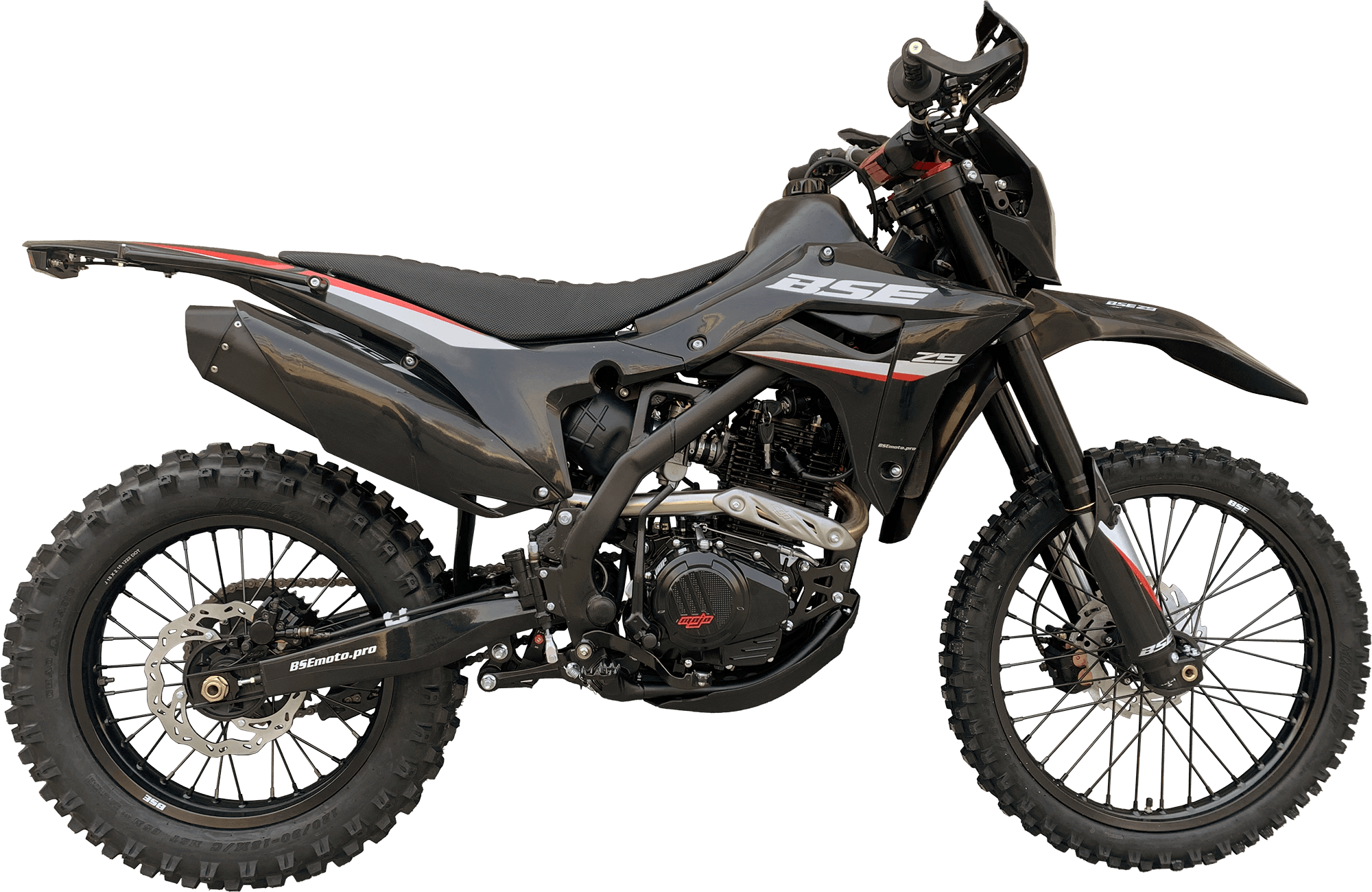 BSE Z9 – полноразмерный спортивный эндуро мотоцикл на стальной раме. Оснащен новым мотором ZS175 300 кубов с воздушным охлаждением. Лёгкий и манёвренный. Выполнен полностью в черном цвете.